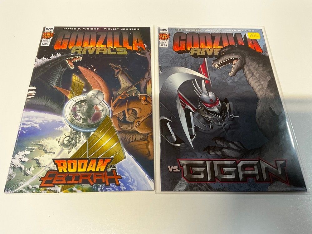 GODZILLA RIVALS #1 VS GIGON , GODZILLA RIVALS #1 RODAN VS EBIRAH ONE SHOTS - 2 issues in all Top Of The Stack Comics Please note that not ALL Listings are FULL or COMPLETE SETS or RUNS. Please read Complete description to see which issue numbers are included within the lot. Please read all of our terms below before bidding Frequently asked questions 1. DO all books come bagged and boarded? Answer is NO we normally will remove boards prior to shipment in order to keep shipping costs low. However we do package exceptionally well to avoid your books being damaged in transit. (we can include boards with shipments for a small fee if desired) 2. Condition of comics - Please inquire on conditions of individual issues before bidding as we list so many books it would be impossible to list the condition of each issue, as books conditions will vary. 3. Shipping rates - " YES " we do combine shipping (Please Ask Us Before you check out) If you are every dissatisfied with your purchase at any time please contact us right away. Thanks and enjoy your comics Top of the Stack Staff