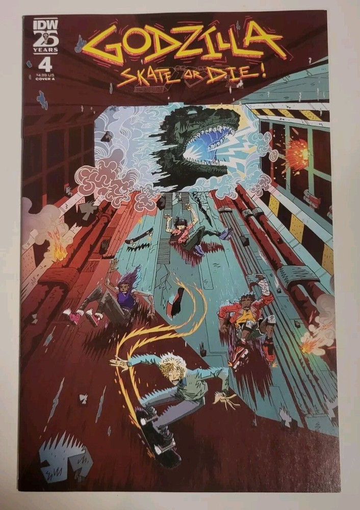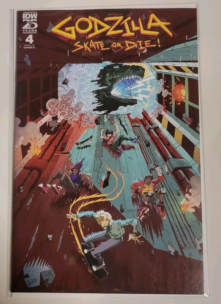 GODZILLA: SKATE OR DIE #4 10/2024 VF+ COVER A (JOYCE) IDW PUBLISHING. Shipped SECURELY USPS Mail. Bagged and Boarded. Godzilla: Skate or Die #4 Cover A (Joyce) We offer EASY AUTOMATIC Combined Shipping! Check out our storefront for details. Please let me know if you have any questions!!! Godzilla, Varan, skater punks, Australia…and now, aliens? Last issue, an earthquake trapped our skater punks underground—and now they find themselves lost in a high-tech military base that was hidden beneath their skatepark?! While the kaiju brawl continues above, our skater punks unwittingly dive farther into the base—and their government’s extraterrestrial secrets—in an attempt to escape with their lives.