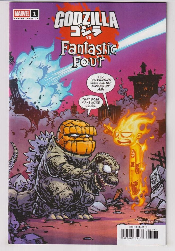 GODZILLA VS FANTASTIC FOUR #1 SKOTTIE YOUNG VAR MARVEL PRH (W) Ryan North (A) John Romita Jr. (CA) Skottie Young THE BATTLE OF THE CENTURY STARTS HERE! The start of six sensational, action-packed issues with MARVEL HEROES battling THE KING OF THE MONSTERS from its many different eras! How will GODZILLA'S lore mix with the MIGHT MARVEL UNIVERSE? Find out as history is twisted when icons like the FANTASTIC FOUR, SPIDER-MAN, HULK, X-MEN and THOR go face off against one of the greatest monsters of all time! This issue, witness a threat never before seen as KING GHIDORAH descends upon the Earth with the POWER COSMIC as GALACTUS' newest HERALD! Can the FANTASTIC FOUR stop him from destroying New York along with the rest of the planet? It's a CITY SMASHING SPECTACULAR as GODZILLA with the help of the SILVER SURFER join forces to stop the world from certain annihilation! A must for MARVEL and GODZILLA FANS! ROUND 1 IN A SERIES OF 6 ONE-SHOT THROWDOWNS! RATED T ------------------------------ Save on shipping by combining extra comics in the cart prior to checkout!!! We do not promise any specific grade or condition. View the scans provided carefully on as large a monitor as possible and if you need more information to decide stop by the store. Not shipping to Canada or other international locations. VA Shipping Destinations and local pick-up will have VA Sales Tax at 5.5% added. Priority Mail shipping is NOT a guaranteed service for shipping time. Most are fast but occasionally one can take weeks to arrive. This is not something we have any control over.
