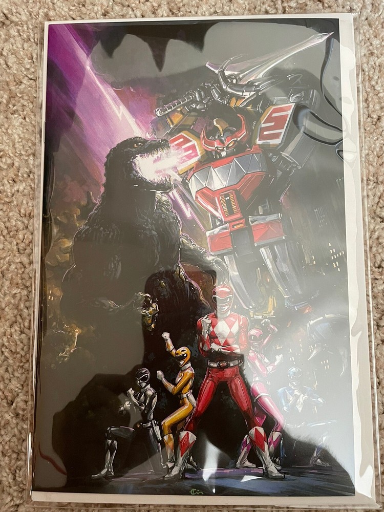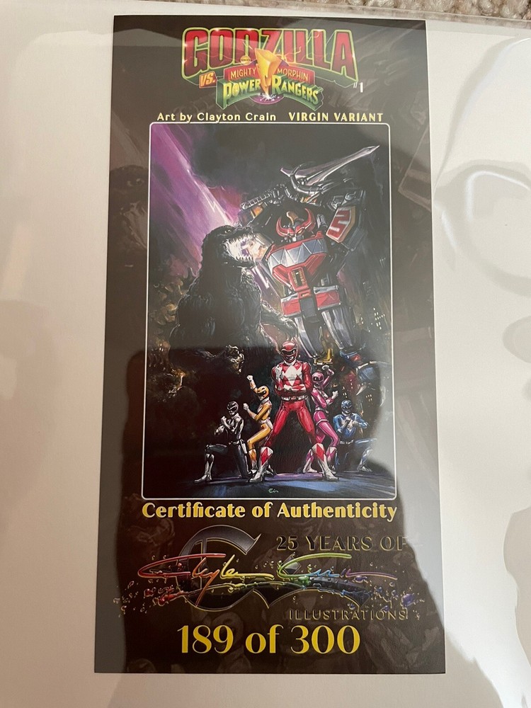 This comic book features an epic battle between Godzilla and the Mighty Morphin Power Rangers. The cover art, created by Clayton Crain, depicts all six rangers and Godzilla in a vibrant and action-packed scene. This issue is a variant cover, with only 300 copies available, numbered 189/300. The comic is a first printing and is in excellent condition. It is a single issue comic book from Boom! Studios, published in 2024, and part of the Power Rangers universe. The comic is not signed or inscribed, but it does feature the artwork of Clayton Crain, who is also the cover artist. This is a must-have for any fan of the Power Rangers or Godzilla franchise.