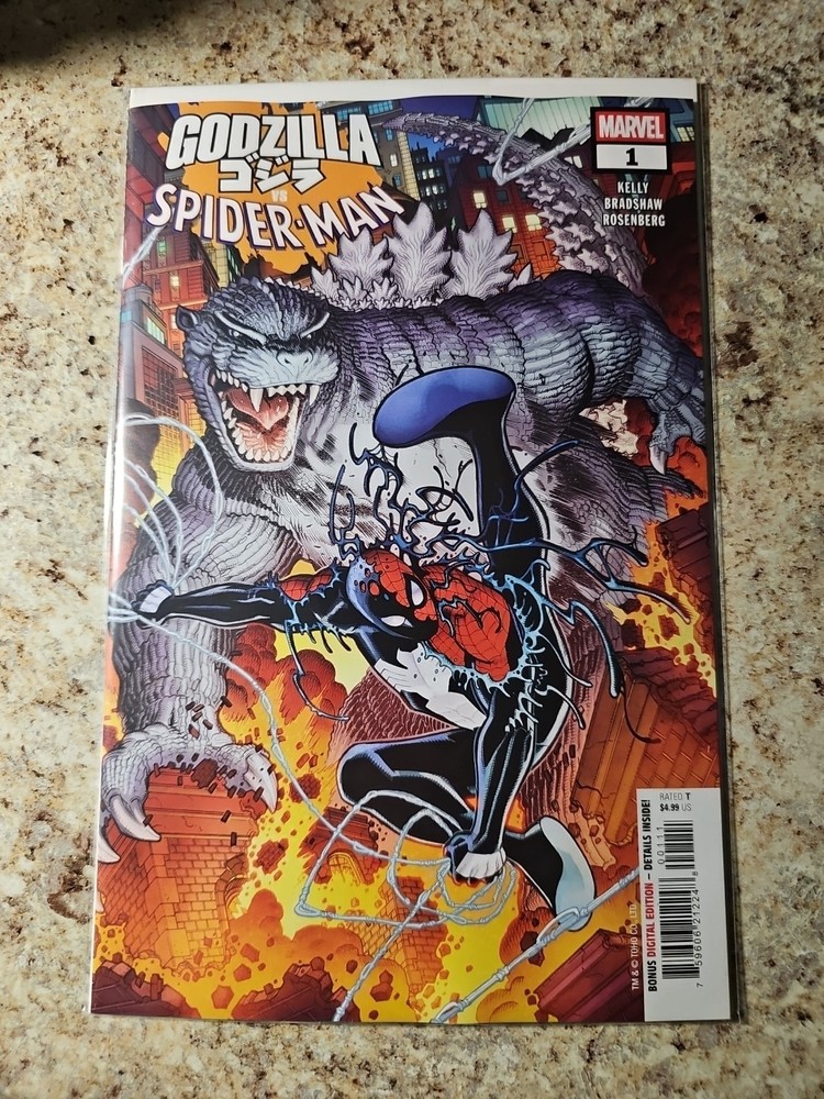 This is an incredible opportunity to own the first issue of the GODZILLA vs SPIDER-MAN series, featuring the amazing artwork of Nick Bradshaw and the brilliant writing of Joe Kelly. The cover is a beautiful variant foil cover, and the comic is in English language. The comic is from Marvel Comics and is a single issue, perfect for collectors of US comics. The story takes place in the Modern Age era (1992-Now) and is categorized under Action, Superheroes, and Adventure. The comic book is bagged and boarded for preservation. Don't miss out on this fantastic addition to your collection!