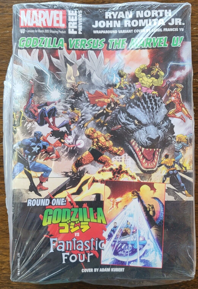 GODZILLA#1 & DOOM#2:10ctBUNDLE/5 & A HALF LBs!/MARVEL PREVIEWS 40/NEW PROMOPAK! UNOPENED SEALED NEW PACK OF TEN MARVEL PROMOTIONAL MAGAZINES FOR MARCH 2025; "MARVEL PREVIEWS" #40 FEATURING NEW EMPEROR DOOM (ONE WORLD UNDER DOOM ARC) #2 AND NEW GODZILLA VS. MARVEL UNIVERSE #1 -- THICK HEAVY CATALOGS JAM-PACKED WITH COMING ATTRACTIONS & SNEAK PEAKS!!! EACH BUNDLE WEIGHS 5 POUNDS 5 OUNCES!!! SHIPS IN A REINFORCED BOX FROM PENGUIN RANDOM HOUSE DESIGNED FOR HEAVY MEDIA :)