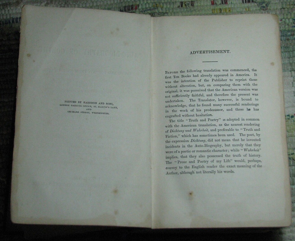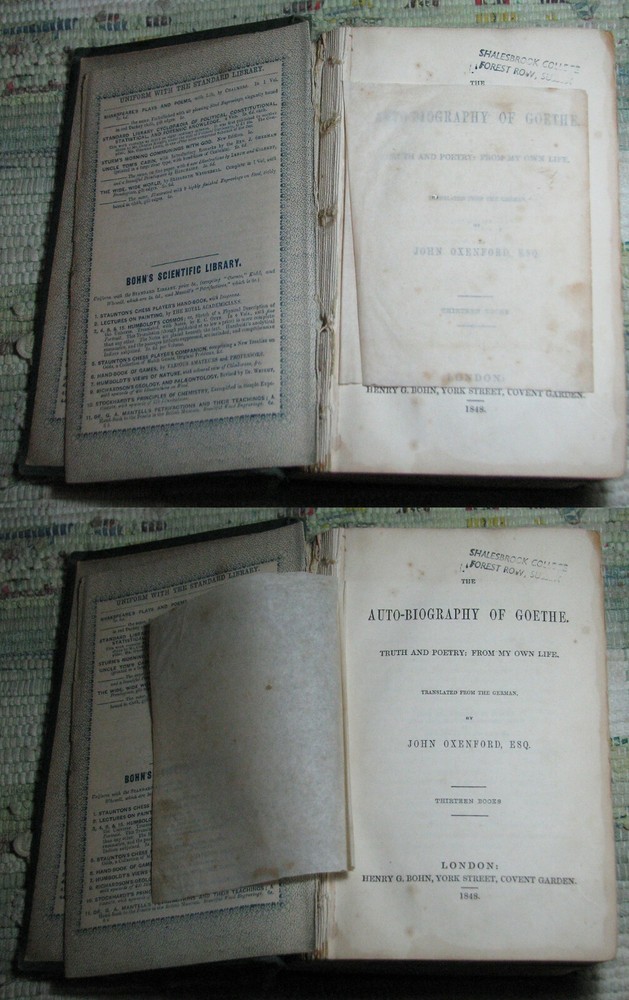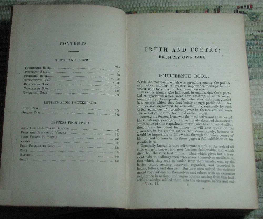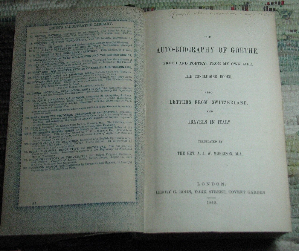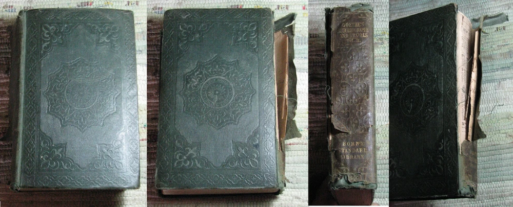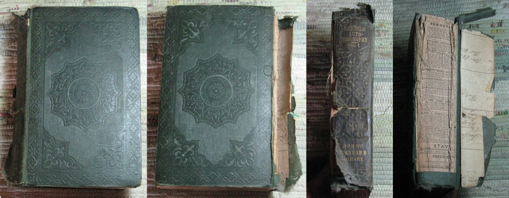 GOETHE'S AUTOBIOGRAPHY AND TRAVELS Volume 1 (1848) & 2 (1849) BOHN'S STANDARD LIBRARY Hardcovers, bound in original dark green cloth with decorative blind tooled boards and gilt title to spine, are in acceptable poor condition, worn weak covers, soiling, rubbings, cuts, chips, dents, bents, partial detachments, previous owners name & stamps, clean text, please see photos by Johann Wolfgang von Goethe Volume I THE AUTO-BIOGRAPHY OF GOETHE. Truth And Poetry: From My Own Life. Thirteen Books. Translated From The German by John Oxenford, ESQ. Volume II THE AUTO-BIOGRAPHY OF GOETHE. Truth And Poetry: From MY Own Life. The Concluding Books. Also LETTERS FROM SWITZERLAND And TRAVELS IN ITALY Translated by The Rev. A. J. W. Morrison, M. A. BOHN'S STANDARD LIBRARY HENRY G. BOHN, London, Great Britain, Volume I: 1848, viii+520 pages, Volume II 1849, 544 pages