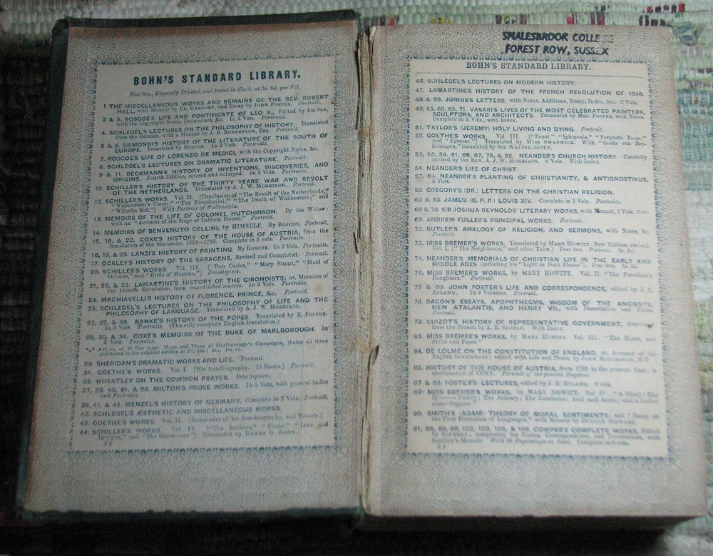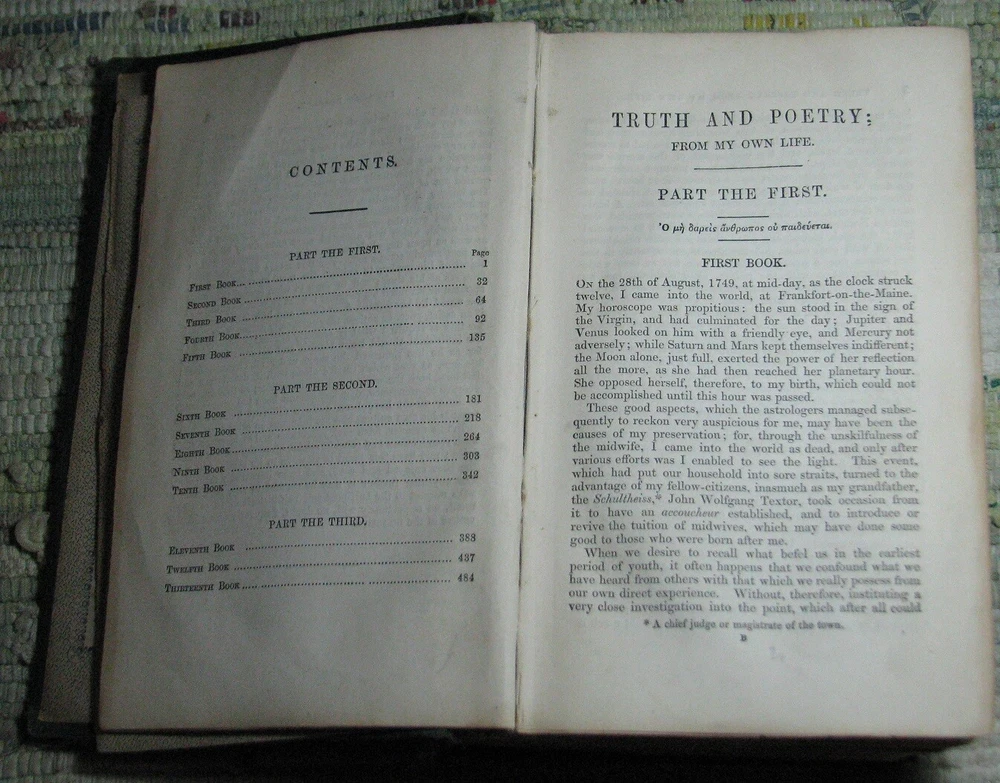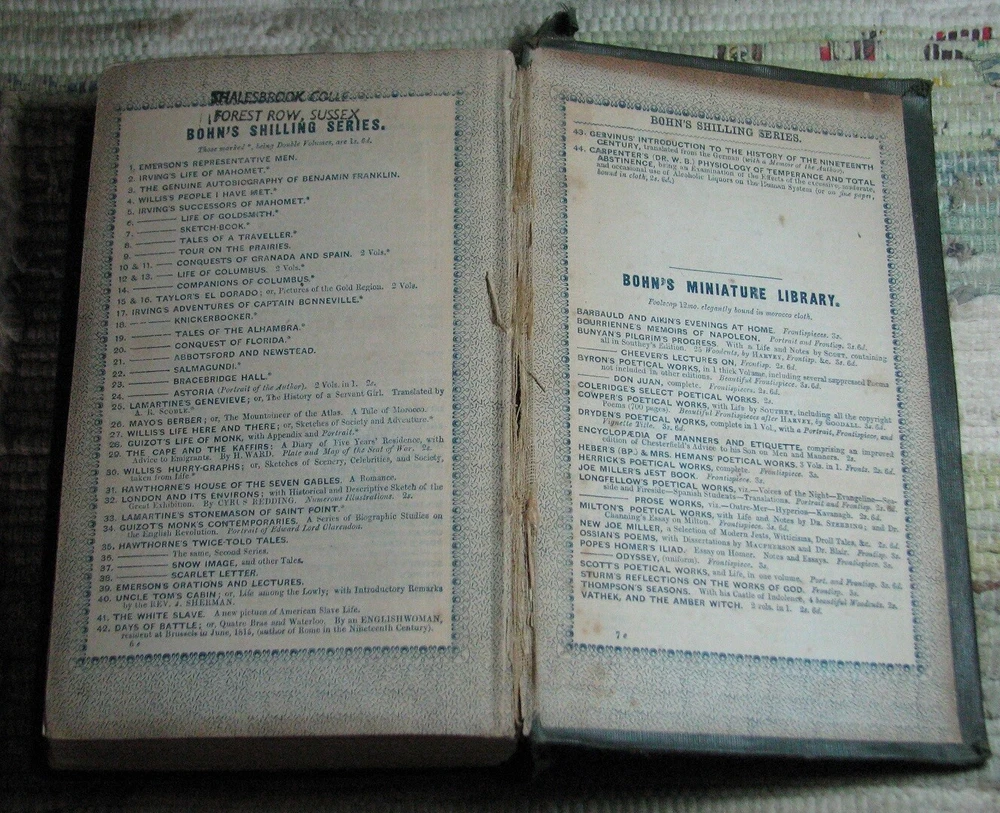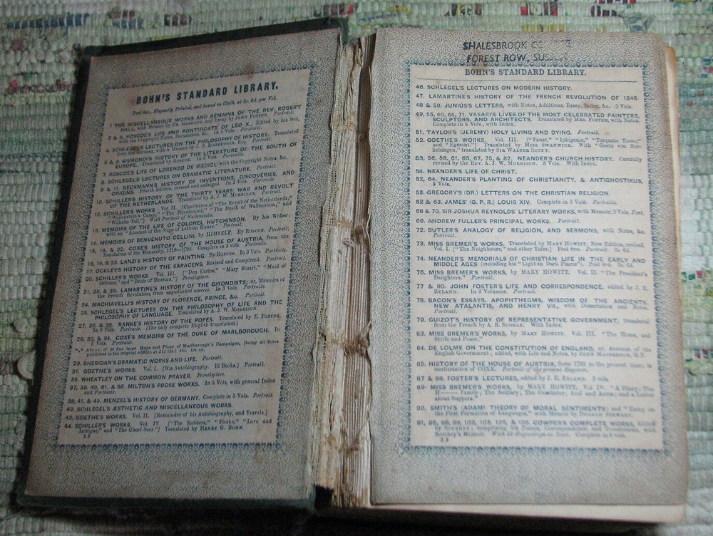 GOETHE'S AUTOBIOGRAPHY AND TRAVELS Volume 1 (1848) & 2 (1849) BOHN'S STANDARD LIBRARY Hardcovers, bound in original dark green cloth with decorative blind tooled boards and gilt title to spine, are in acceptable poor condition, worn weak covers, soiling, rubbings, cuts, chips, dents, bents, partial detachments, previous owners name & stamps, clean text, please see photos by Johann Wolfgang von Goethe Volume I THE AUTO-BIOGRAPHY OF GOETHE. Truth And Poetry: From My Own Life. Thirteen Books. Translated From The German by John Oxenford, ESQ. Volume II THE AUTO-BIOGRAPHY OF GOETHE. Truth And Poetry: From MY Own Life. The Concluding Books. Also LETTERS FROM SWITZERLAND And TRAVELS IN ITALY Translated by The Rev. A. J. W. Morrison, M. A. BOHN'S STANDARD LIBRARY HENRY G. BOHN, London, Great Britain, Volume I: 1848, viii+520 pages, Volume II 1849, 544 pages