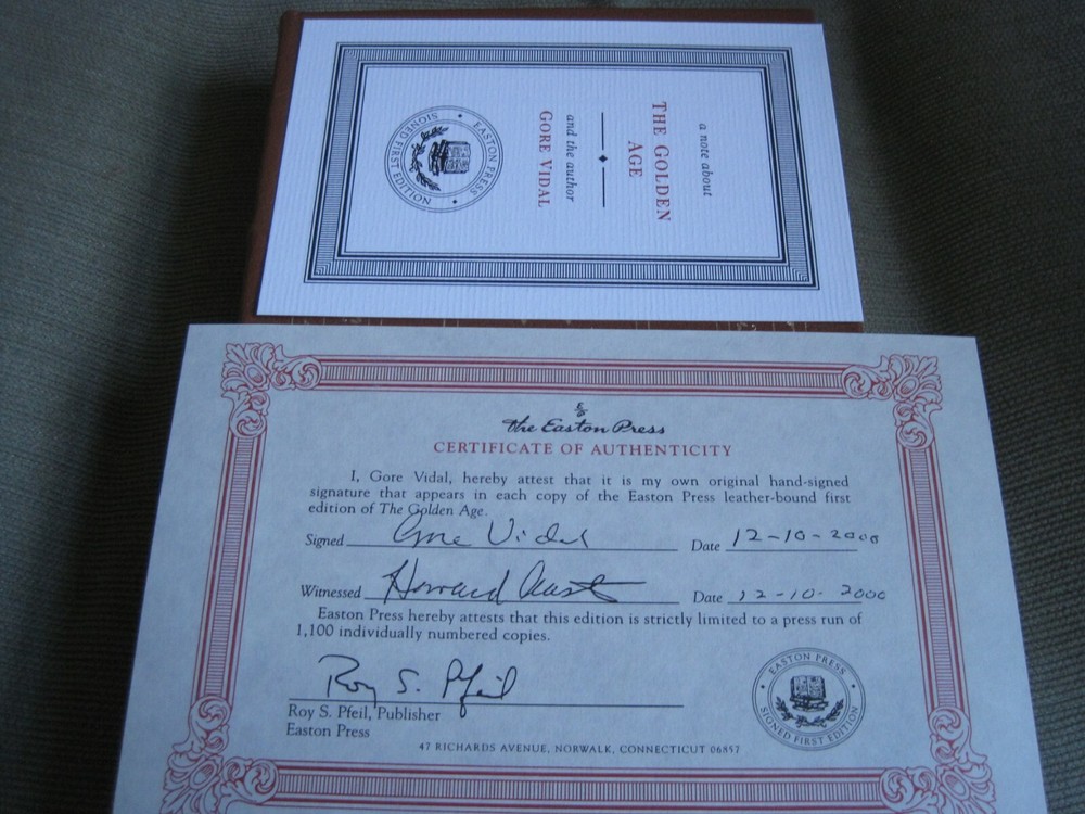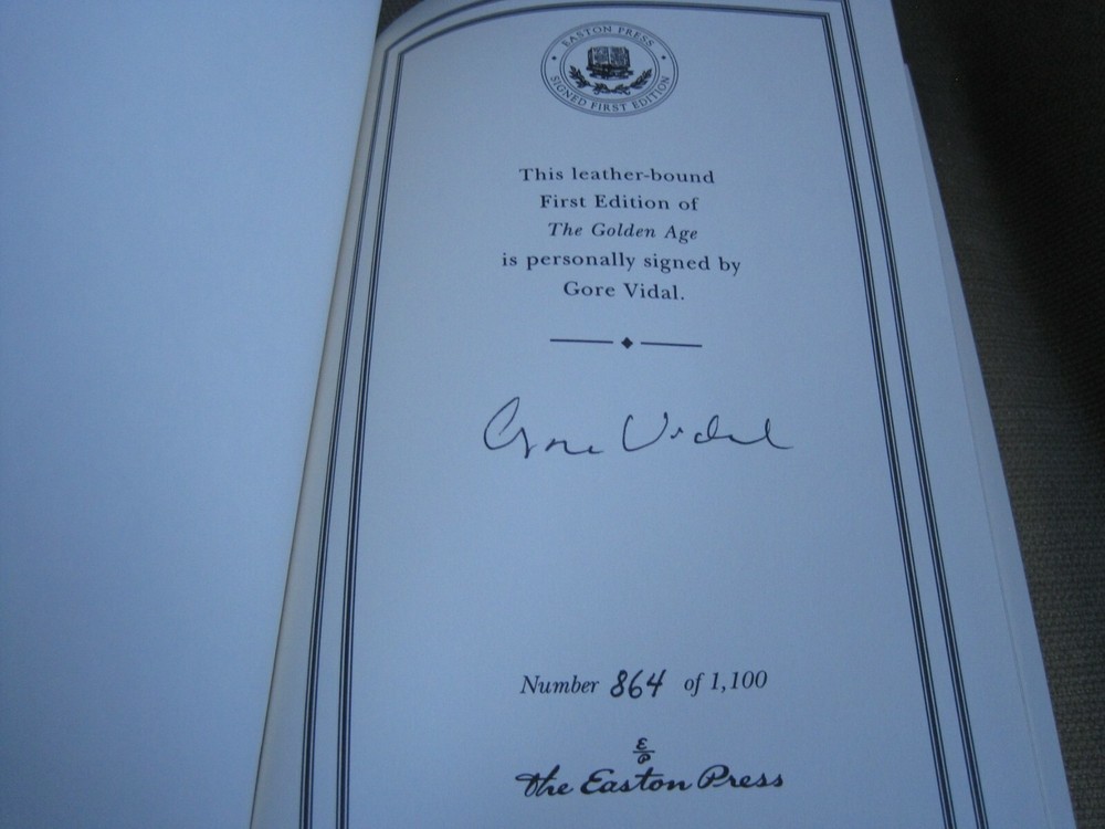 This is a leather bound signed numbered first edition of late writer, public intellectual and political thinker Gore Vidal's best-seller - "The Golden Age" . The book is unread and in great condition with just minor imperfections of the gold gild on the side of the pages (see images). Signed by the author on the limitation page, it also includes a signed and dated certificate of authenticity and the publisher's note card. This is number 864 of only 1100 copies ever printed of this limited first edition. Easton Press books are the golden standard in the publishing industry, highly collectible and lasting generations. Easton Press Full Genuine Leather Dubbed Spine Accented Wit 22 kt. Real Gold Satin Ribbon Page Marker Distinctive Cover Design Gilded Page Edges To Protect Against Humidity High Quality Acid - Free paper Smyth-Sewn Pages Silk-Moire Endleaves I combine multiple items for savings on shipping charges. I ship worldwide. Please ask about international shipping charges and/or different shipping options.Thank you!
