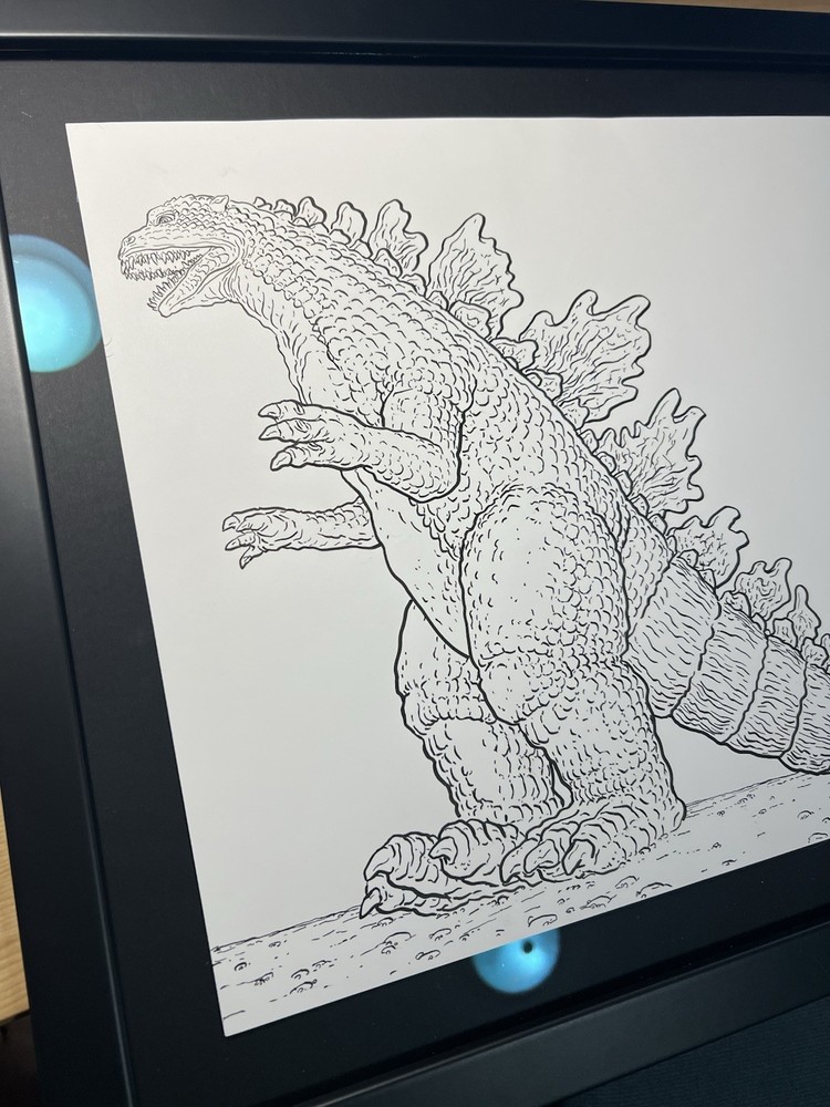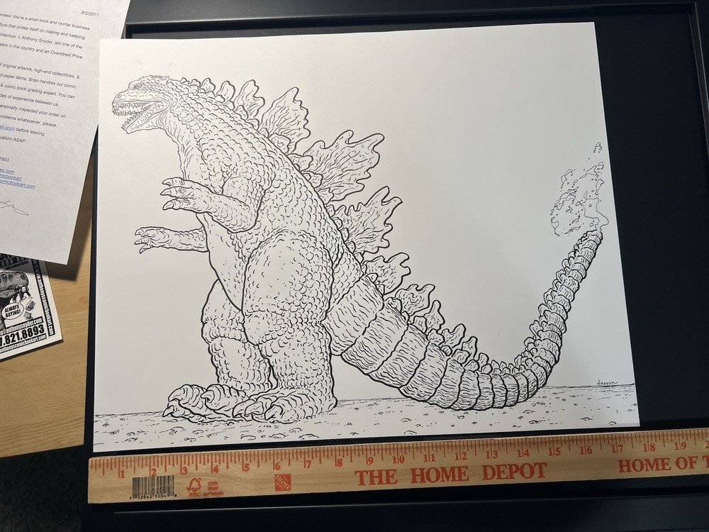 Unleash the king of monsters in your collection with Geof Darrow's original artwork featuring the iconic Godzilla. Capturing the essence of modern age comics, this piece stands at an impressive 18" x 14", with every detail meticulously brought to life by the renowned illustrator himself. Beyond just a visual piece, this artwork is a testament to the rich tradition of his love for monsters, complete with the artist's signature. It's a must-have for enthusiasts and collectors alike, offering a unique glimpse into the thrilling world and the legendary lore of Godzilla. Yeah! This will be shipped for free using USPS Ground Advantage (with tracking provided!) Please let me know if you have any questions.