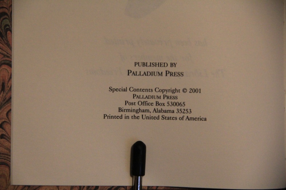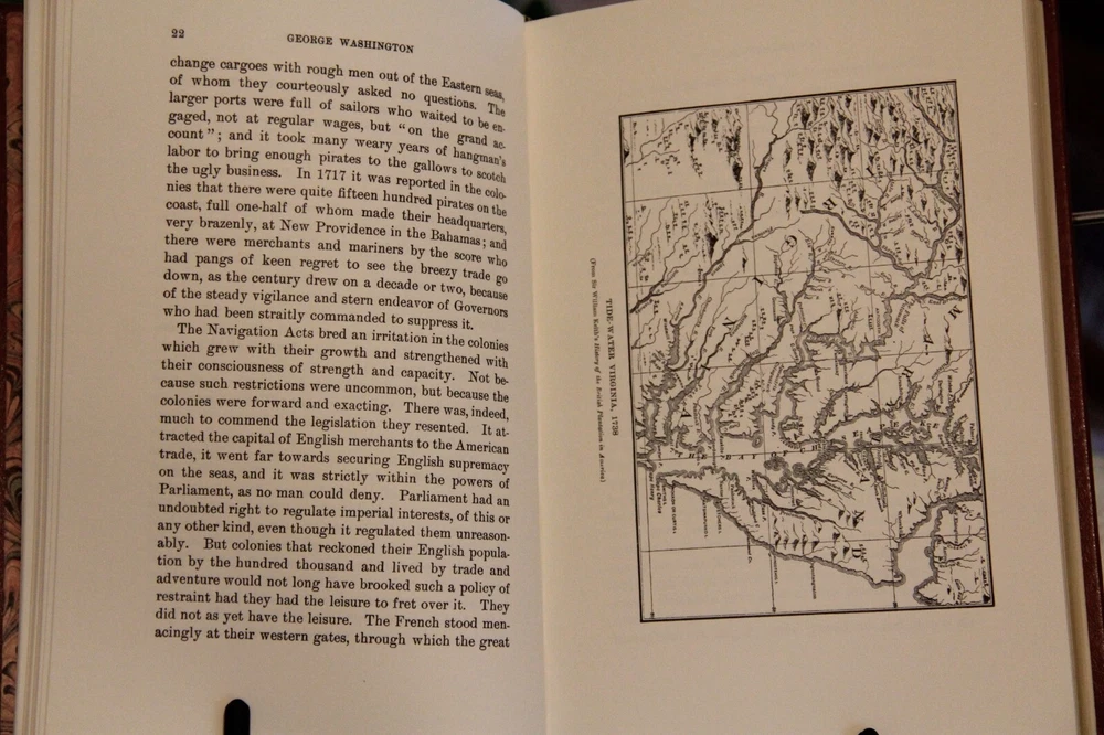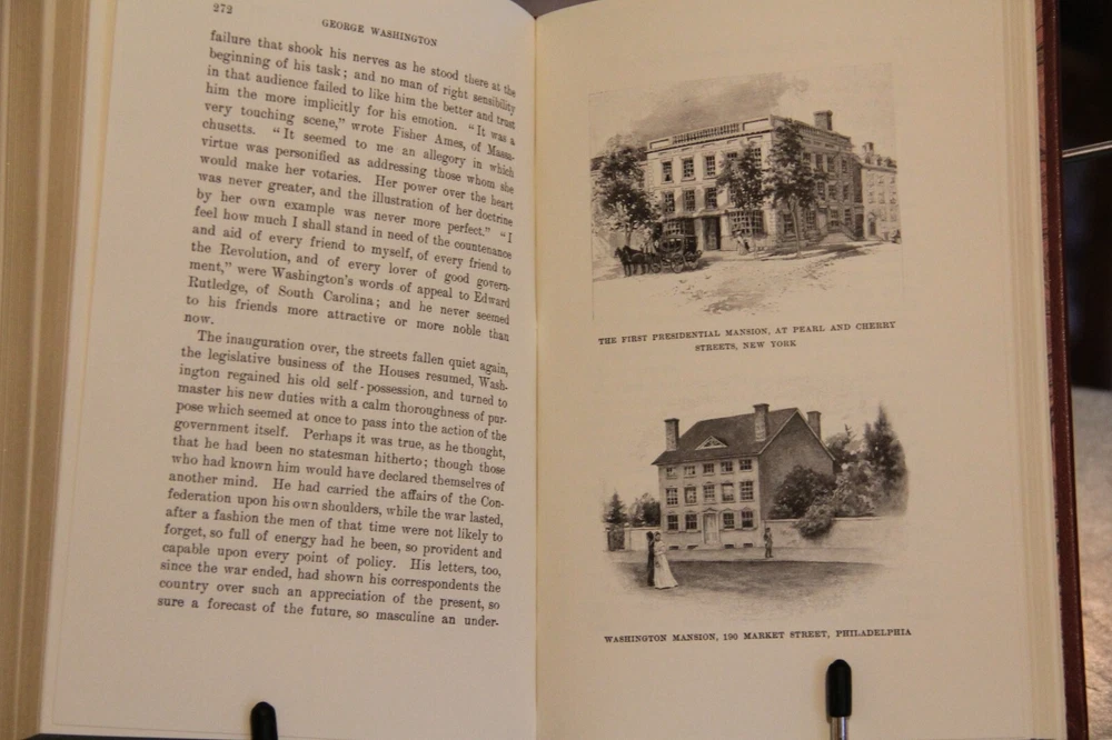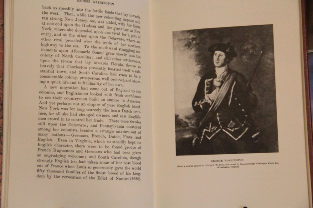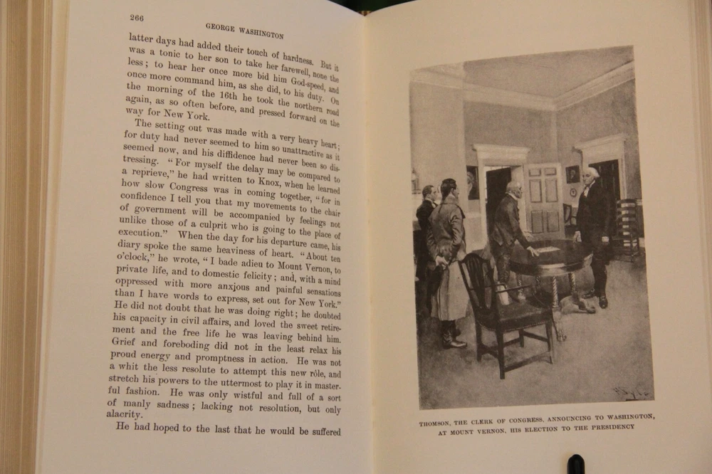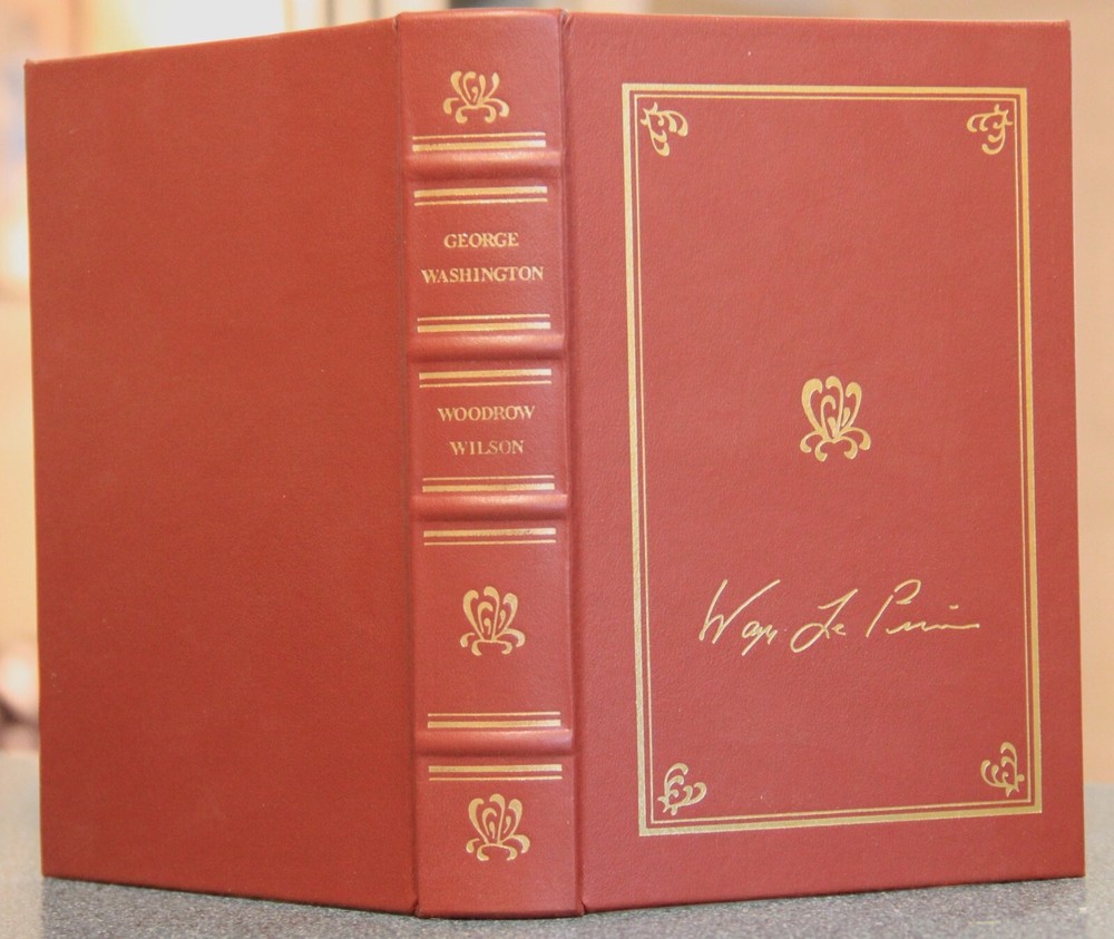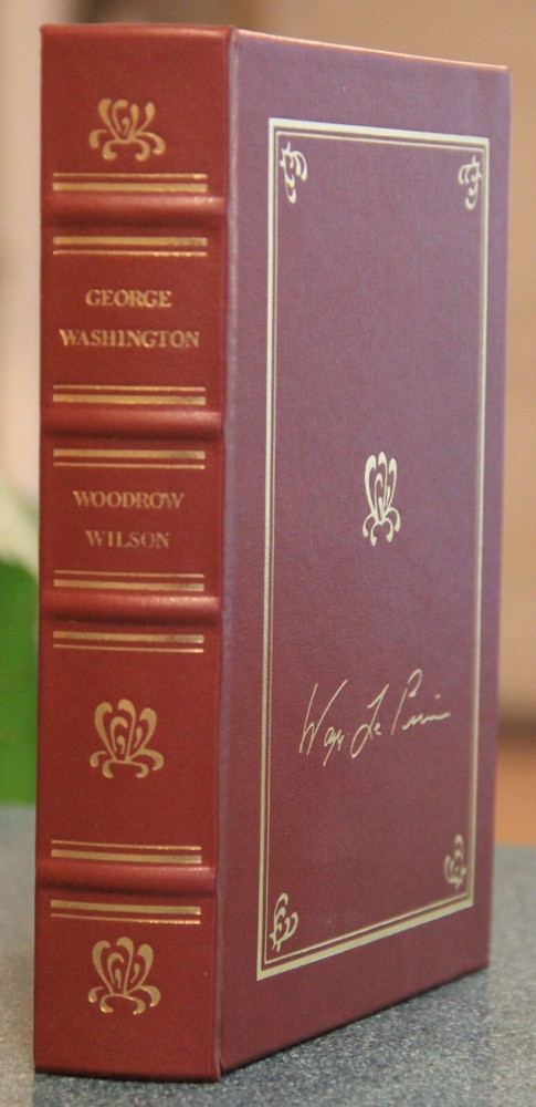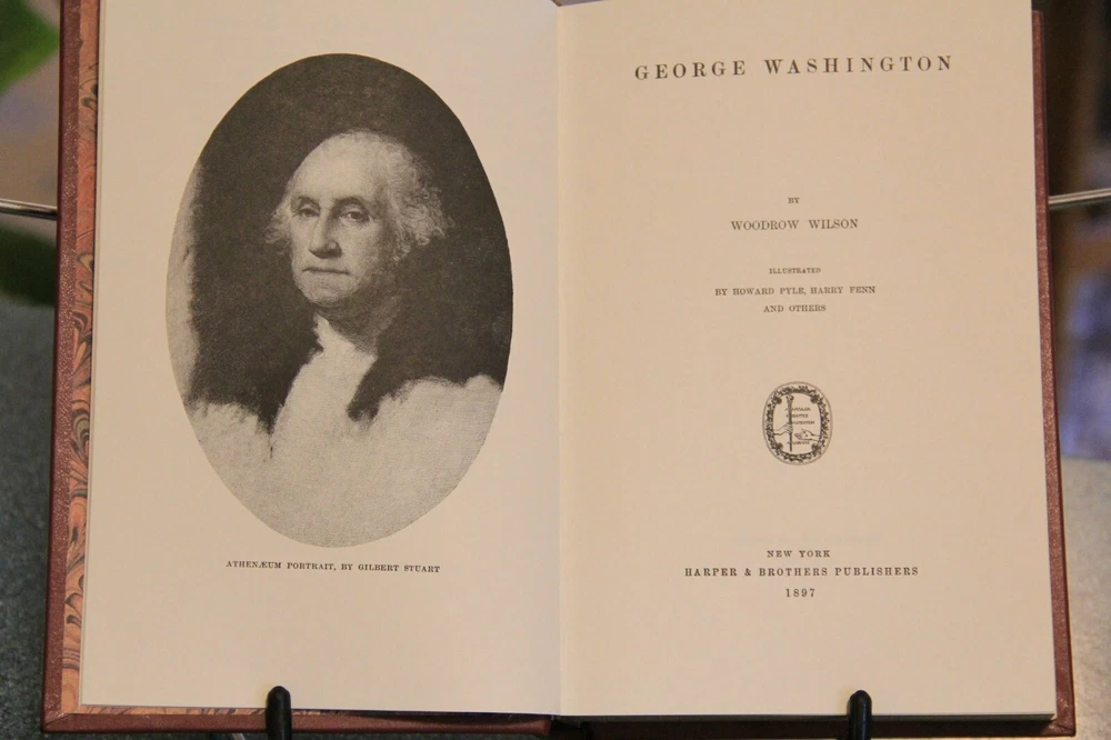 "George Washington," by Woodrow Wilson, 2001 facsimile of first edition of 1987, published by Harper & Brothers. Includes numerous illustrations by Howard Pyle, Harry Penn and others, scattered throughout the text. Published in 2001, privately printed for the members of The Library of American Freedoms. With index, 333 pages. With an introduction by Wayne LaPierre. Film was prepared from an original 1897 edition. B ound in leather, with raised bands on the spine, marbled endleaves, and gilded page edges. The spines were brass-die stamped in 22-karat gold, and cover stampings and design of the edition were by Selma Ordewer. I pack carefully and ship promptly, free via USPS Media Mail.
