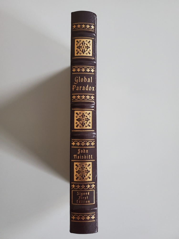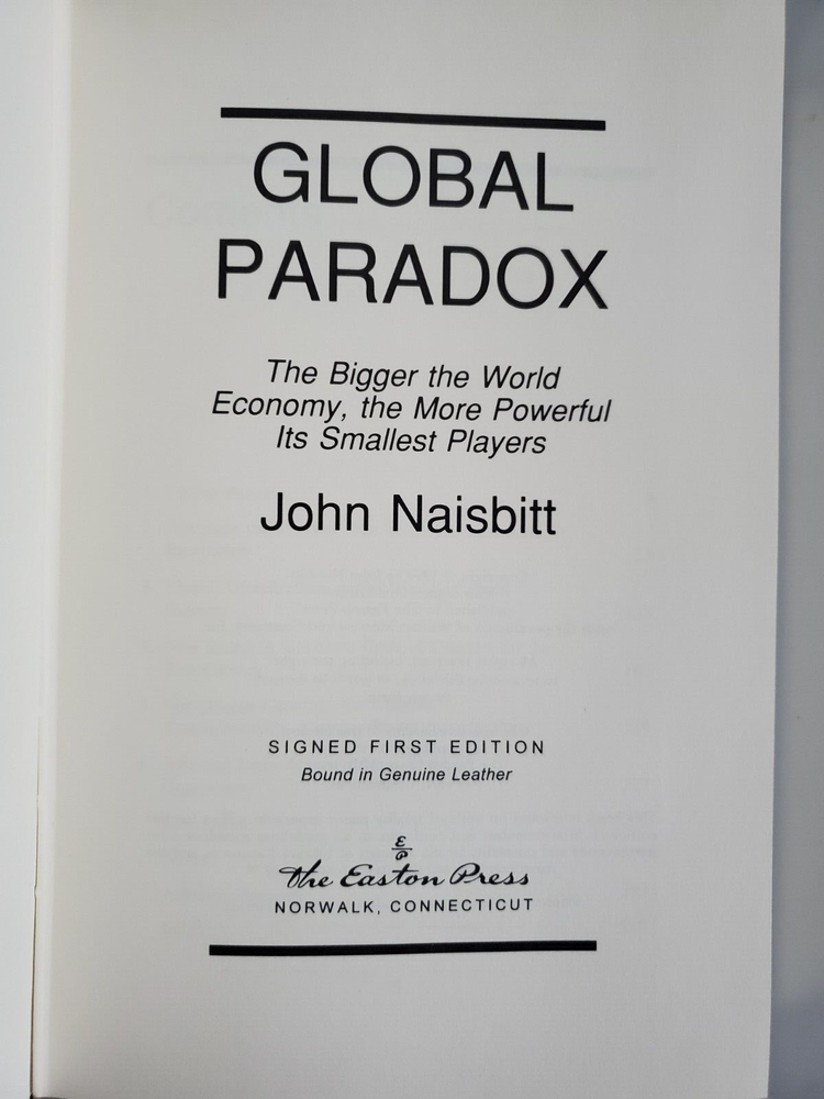 Global Paradox: The Bigger the World Economy, the More Powerful its Smallest Players by John Naisbitt. Like new Easton Press Signed First Edition. This hardcover book boasts the features that are expected from Easton Press: signed by the author, bound in genuine leather, with gold lettering and decorations on the cover and spine, gilded page edging and a sewn-in satin bookmark. Decorative pattern is the same on front and back cover. The text is printed on archival quality acid-neutral paper. These books are a pleasure both to display and to read.