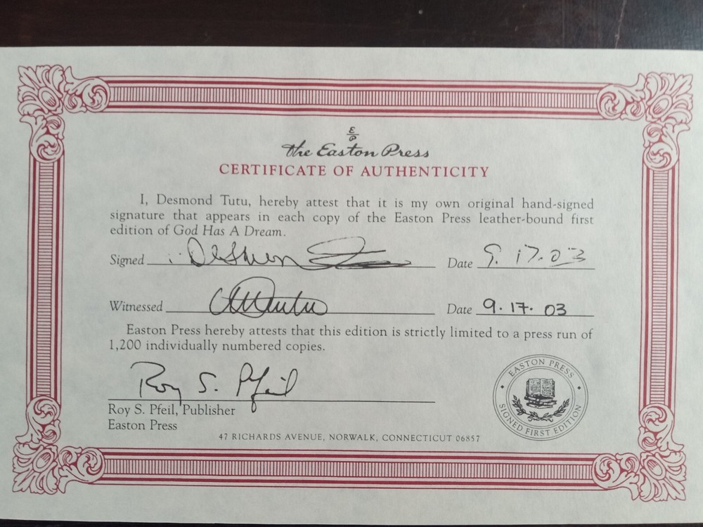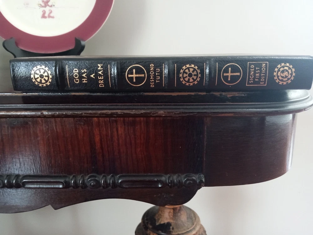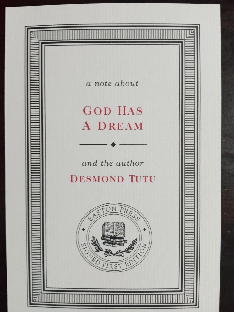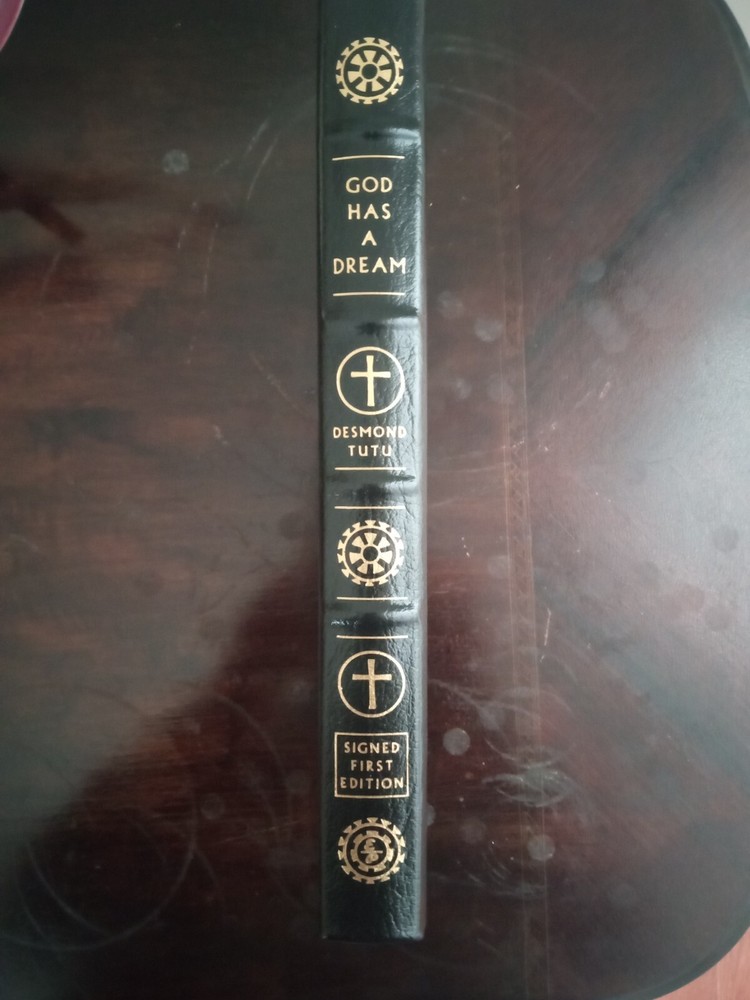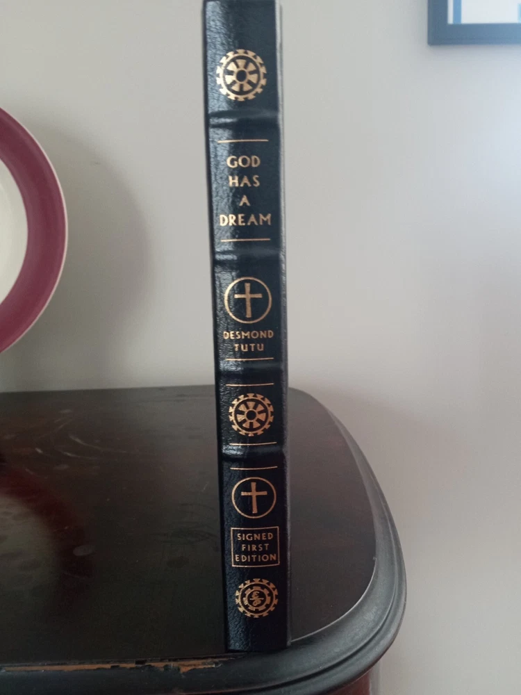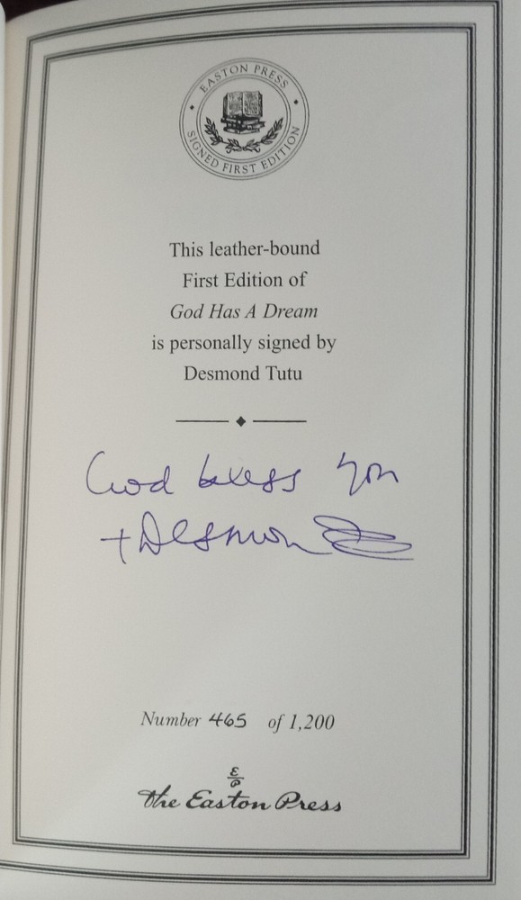 This is a new, unread, gold leaf leather bound first edition hardcover book titled "God Has A Dream" by Desmond Tutu. Written in English, it is a limited edition specifically numbered 465 out of 1200 and is signed by the author. Published by Easton Press it is 134 pages long and measures 6" x9" x1"