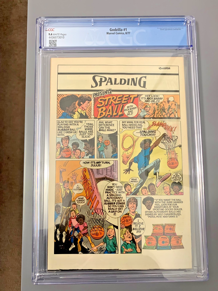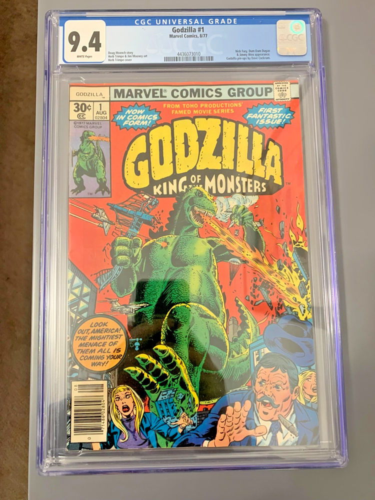 Godzilla #1 CGC 9.4 (Marvel Comics 1977) Nick Fury Appearance White Pgs Condition: CGC 9.4 NM with White Pages Type of Holder: Modern Degree Of Restoration: Unrestored Publisher: Marvel Comics Page Quality: WHITE Pages Comments: 1977, Nick Fury appears Marvel brought the King of the Monsters to comic books with this August, 1977 premiere issue of Godzilla. The offered example has been graded Near Mint 9.4 by CGC. Adding to its desirability, it has also retained newsstand-fresh White Pages.