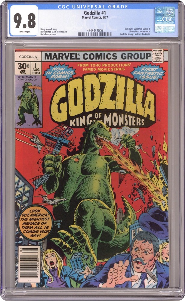 Menu Categories Featured Comics New Comics Comic Book Value Packs Key Comics & First Appearances Pre-Code Horror Comics Good Girl Art Comics Promotional Comics Comics Pre-1940 Comics 1940s Comics 1950s Comics 1960s Comics 1970s Comics 1980s Comics 1990s Comics 2000s Comics 2010-Curent Other Comics Graphic Novels, Books Fanzines Vintage Paperbacks Pulps and Digests Men's Adventure Non-comic Magazines Godzilla #1 CGC 9.8 1977 4543432006 Grade CGC 9.8 Page Quality White Year 1977 Publisher Marvel Any CGC case may have minor imperfections including Newton rings, scuffs, standard surface wear, or minor cracks. CGC considers these defects acceptable, as do we. If there is any significant damage to the slab it will be noted in our description, and we will not list any slabbed comics with a damaged case that compromises the integrity of the grade. Description "The Coming!" Guest-starring Nick Fury and S.H.I.E.L.D. Story by Doug Moench. Art by Herb Trimpe and Jim Mooney. The slumbering leviathan known as Godzilla has awaken and rises out of the sea off the shores of Alaska. This reptilian titan has already left Japan devastated and now has made his way to America. With a tail that can smash mountains to dust and fiery breath born out of the Atomic Age, is there anything that can stop this monster's rampage? Right from the Toho Productions' famed movie series comes Godzilla, King of the Monsters. This item is a consignment This item is a consignment, which means that the price has been set by the consignor rather than by MyComicShop. It is located at our headquarters and ships just as quickly as everything else we carry. Grading & Packing We take pride in our accurate, consistent grading. You can be confident in receiving a well-graded comic when ordering from us. We understand that condition is important to collectors. We pack your comics with professional care and high-quality packaging to insure your purchase reaches you safely. About Us We opened our first comic retail store in 1977 and operated a chain of eight comic book stores in the 80s, 90s, and 2000s before going online-only. We are the world's largest comic book seller and the biggest and most trusted comic seller on eBay with over 3.6 million comics sold. We Buy & Consign We buy tens of thousands of comics every month from collections large and small, old and new. We also accept consignments and will get your comics listed on eBay for you. Check out our website for more info. Copyright © 2025 MyComicShop & Lone Star Comics. All rights reserved.