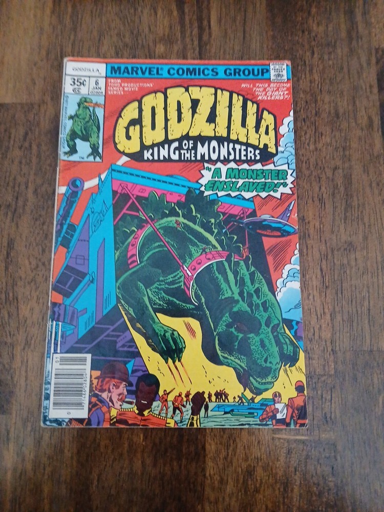 The product is a comic book titled "Godzilla (1977 Marvel) #6 Jan 1978 A Monster Enslaved" written by Doug Moench. It is part of the "Godzilla" series by Marvel, published in 1978 during the Bronze Age era of comics. The story features Godzilla as the main character and includes the superhero team S.H.I.E.L.D. in an action-packed adventure. This collectible comic is a single issue that showcases Godzilla in a compelling storyline within the US Comics tradition.