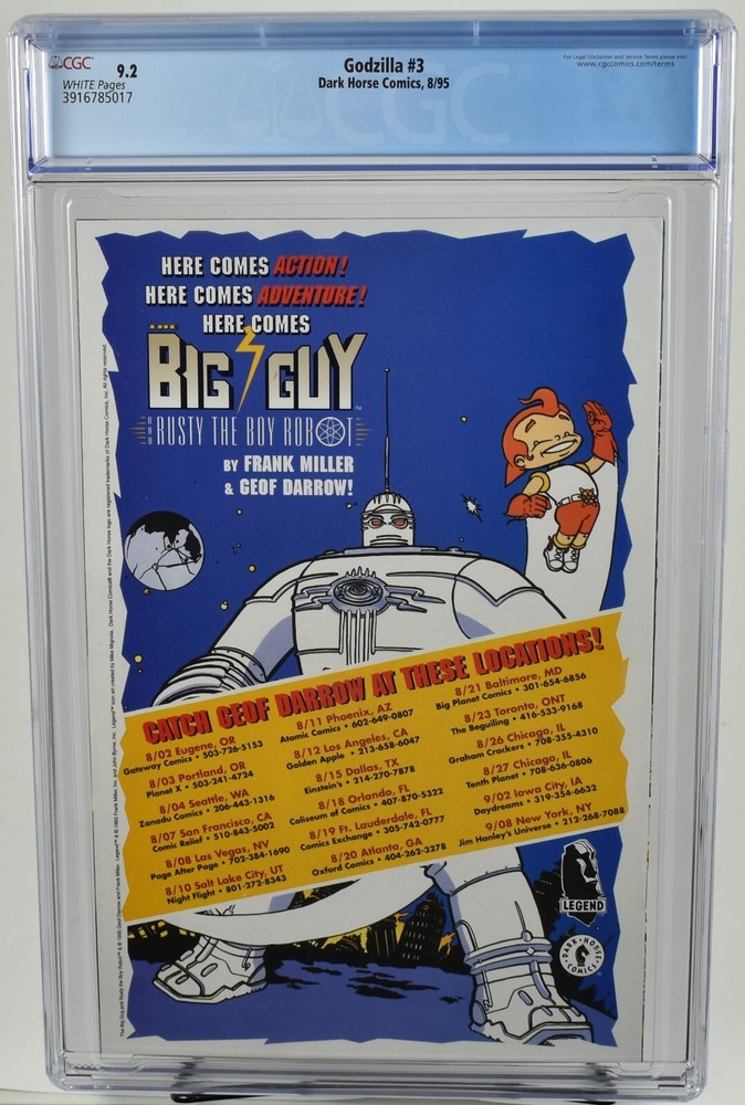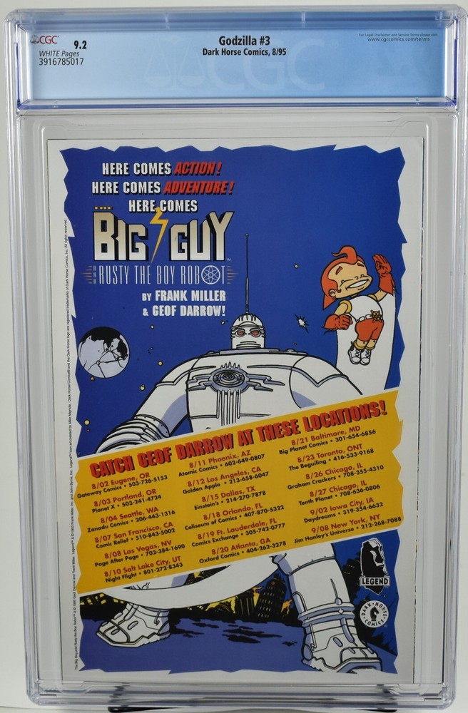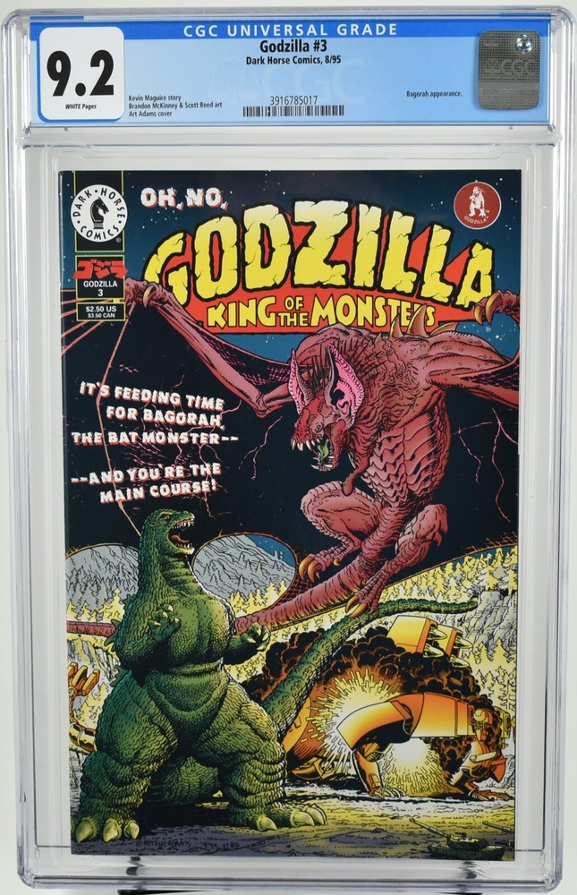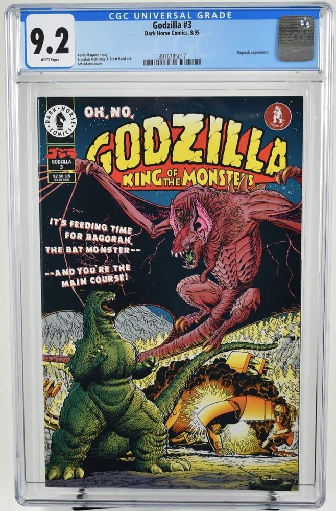 Style Sheet Template 2.1 GODZILLA #3 CGC GRADED 9.2 (1995) DARK HORSE COMICS ITEM DESCRIPTION Bagorah appearance. Kevin Maguire - Story Brandon McKinney & Scott Reed - Art Art Adams - Cover CGC Graded 9.2 ~ WHITE Pages ~ Photos have been provided as a visual condition of this item. More pictures can be provided upon request. Please inquire if you have any questions or concerns about this item before purchasing. Thank you! SHIPPING INFORMATION FOR THIS ITEM We offer combined shipping for multiple items purchased! Please inquire as rates vary depending on items purchased THIS ITEM SHIPS IN THE U.S. USING USPS WITH TRACKING. THIS ITEM IS NOT AVAILABLE FOR INTERNATIONAL SHIPPING. Shipping cost is calculated based on buyer’s location. SALES TAX CHARGED TO APPLICABLE STATE RESIDENTS. ACCEPTED PAYMENT METHOD - PAYPAL & MAJOR CREDIT CARDS PAYPAL & MAJOR CREDIT CARDS COSTUMERS: We can only send your merchandise to the confirmed address provided by "Ebay". Please do not ask for merchandise to be sent to other addresses other than the confirmed address provided to us directly by "Ebay". A confirmed address cannot be changed once the transaction has been paid for. Such a request to change your address after payment will result in the cancellation of your transaction. Thank you for your cooperation. Click the "Sign Up For Store Newsletter" link near the top of this page to receive weekly e-mails featuring our newly listed items! THANKS FOR LOOKING!