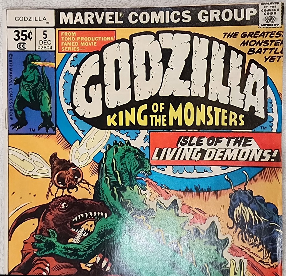 Godzilla #5 (9.0+ approx.) (1977) - Isle of Lost Monsters - S.H.I.E.L.D - Dr. Demonicus - News Stand Issue Very nice, clean book "The Isle of Lost Monsters!" Part 2 of 2. Story by Doug Moench. Art by Tim Sutton and Klaus Janson. Godzilla is being assaulted from all sides. First, the government task force known as S.H.I.E.L.D. attempts to wrangle in the leviathan. Then, the diabolical Dr. Demonicus sends an army of giant creatures to take down the fire breathing threat to his plan for world domination. It's a showdown on the Isle of Lost Monsters. Cover price $0.35. Shipped bagged and boarded The picture is actual item(s) you will receive . Buyer to pay $4.95 USPS Media mail shipping (Flat box or envelope) Shipping outside the U.S. is additional postage (Canada is additional cost). Texas residents add sales tax. Ship to USA, can ship worldwide, but additional shipping charges applied. Seller not responsible for incorrect address or losses occurring due to buyer mistake. Payment due in 3 days please or will be re-listed and appropriate feedback applied. Thank you and be sure to check out my other auctions - Normally I can combine shipping on multiple auctions