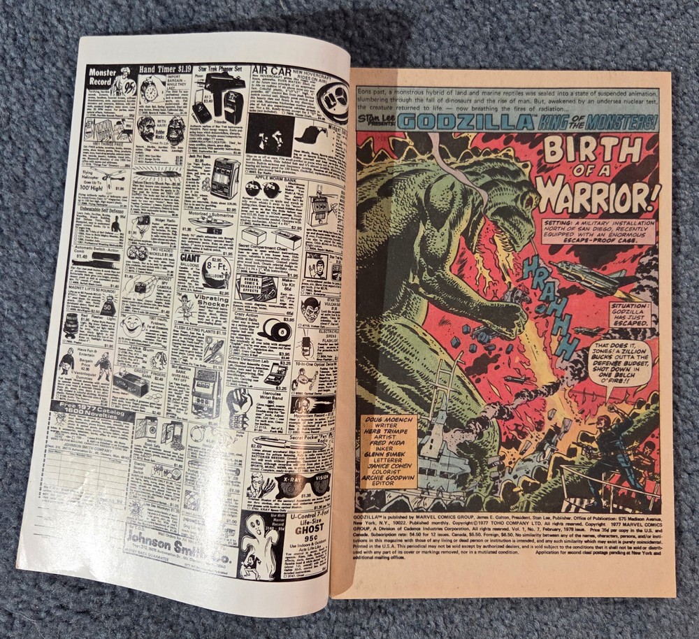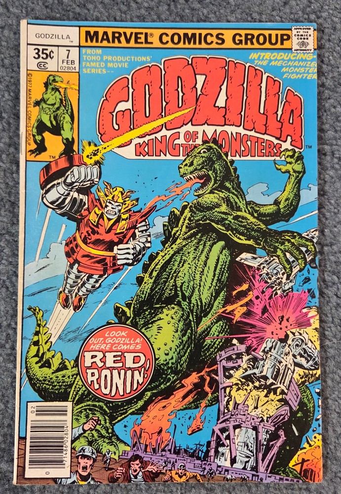 Dive into the gripping world of monsters and mayhem with Godzilla #7, the King of the Monsters issue that features the first appearance of Red Ronin. Published in 1978 by Marvel Comics during the vibrant Bronze Age of comics, this edition is a must-have for enthusiasts and collectors alike. With its rich storytelling by Doug Moench and eye-catching artwork by Herb Trimpe, this comic book is a key issue that stands out in any collection. The newsstand edition you're looking at is a treasure for several reasons, including its status as a first printing 1st edition. It comes boarded for added protection and includes a dust jacket to preserve its vintage charm. This single unit comic book is graded at a 7.0 Fine/Very Fine and is perfect for a general audience. Dive into the Marvel Universe and enjoy a piece of comic book history with this iconic issue of Godzilla. This is a solid comic....FN/VF. No rips, tears or folds, just a few spine ticks and mini scuffs at the top and bottom of the spine. Off-white pages. The back is swell. Please email us with any questions.[6319J]