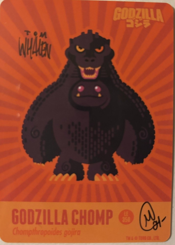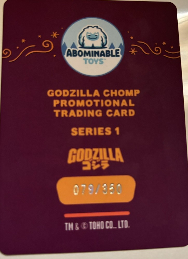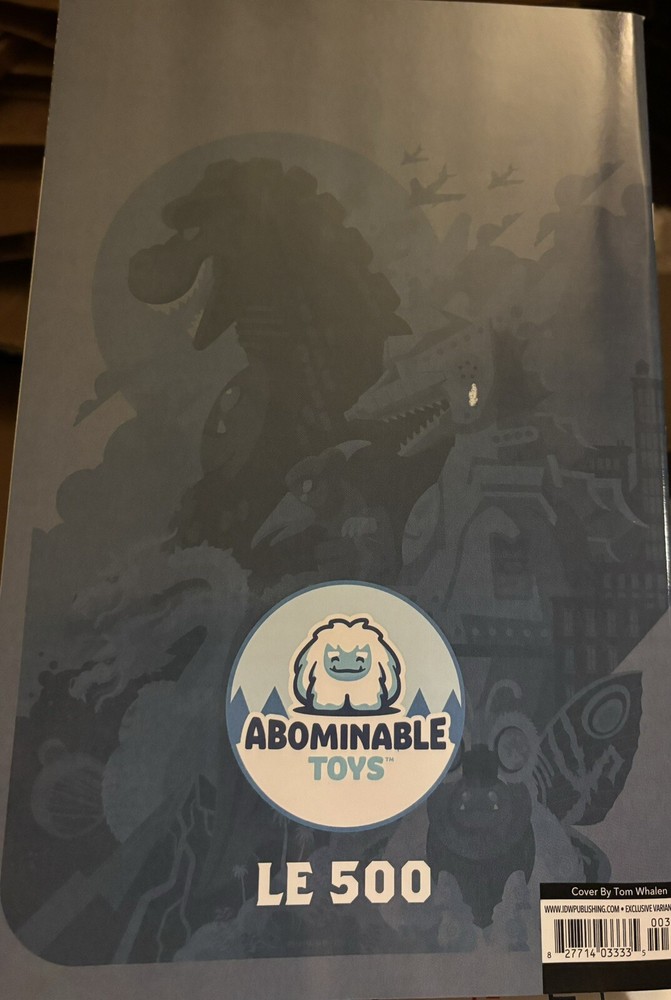 Celebrate Godzilla's 70th anniversary with this exclusive NYCC 2024 Abominable Toys Chomp collector's item. This single unit comic book features the iconic character Godzilla, signed by Connor McConnell and cover art by Tom Whelan. The series title is "Abominations" and it is published by Abominable Toys. Comic signed by creator Connor McConnell. Comes with card signed by Connor McConnell and Tom Whelan. Blemish/color rub on back of comic.