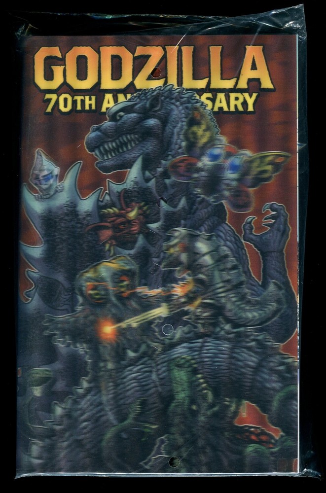 Godzilla 70th Anniversary SDCC Exclusive Variant One-Shot Comic Featuring the San Diego Comic Convention Exclusive Lenticular Variant Cover by Matt Frank. Awesome!! Editors: Jake Williams, Jamie S. Rich, & David Mariotte SDCC Exclusive Lenticular Variant Cover by: Matt Frank Celebrating 70 years of Godzilla! Since 1954, Godzilla has been King of the Monsters, and what better way to celebrate than with a gigantic anthology of tales that get to the heart of Godzilla's lasting popularity! From the American Old West to modern Tokyo and beyond, this collection features stories of the King of the Monsters fighting with its allies like Mothra, against old enemies like the terrible Mechagodzilla , and reshaping the lives of all who fall in its path! Nine titanic stories by first-time and beloved Godzilla creators alike, including Joelle Jones ( Catwoman ), Michael Conrad (Wonder Woman), Matt Frank (Godzilla: Rulers of Earth), James Stokoe (Godzilla: The Half-Century War), Adam Gorham (Ms. Marvel: The New Mutant), Dan DiDio (Metal Men), and many more! Stories/Spoilers: “The Half-Century Bore” Writer: James Stokoe Artist: James Stokoe Letterer: James Stokoe James Stokoe’s opening story shows us a Godzilla through the eyes of the men who have to clean up his messes. A companion piece to Stokoe’s excellent The Half-Century War miniseries. The story actually takes one of the concepts touched upon briefly in that series and expands on it a bit, that of the OTHER specialized teams employed by the Anti-Megalosaurus Force. This particular story focuses on Mehmet Yilmaz and Ömer Bulut as they deal with studying and containing the Smog Monster himself, Hedorah . “Contagion” Writer: Dan Didio Artist: Joelle Jones Colorist: Marco Lesko Letterer: Rus Wooton This story focuses on virologist Mizuno, who has developed a mysterious virus. It’s never quite clear for what reason the virus was developed (Mizuno stresses that it “was never meant to be weaponized”), but it ends up being all for naught anyways, as the virus unleashes a kaiju! “Of Gods and Con Artist” Writer: Danny Lore Artist: Sebastian Piriz Letterer: Rus Wooton Lore and Piriz use the parallels of a monster fight and the petty squabbles of two criminals in the devastated city below. The story follows Ito, the titular con artist as he attempts to sell fake Destoroyah remains to a local crime family for a quick buck. An expert, Dr. Kikuchi, almost finds our not-quite-hero out, but Ito is saved at the last minute as the city is caught up in a titanic battle between Godzilla and Biollante. Hara, the crime family’s muscle, survives and attempts to kill Ito for his lies, but things don’t go so well for him either, with Ito realizing that in the grand scheme of things, all his lies over the years are infinitesimal compared to the size of these monsters. “In the Shadow of a God” Writer: Matt Frank Artist: Matt Frank Poetry: Donny Winter Japanese Calligraphy: Maki Takarada Matt Frank’s manga-inspired story shows us the King of Monsters through the compassionate eyes of a child. The story follows an unnamed school-girl caught up in Godzilla’s attack in 1954. Seemingly the only sign of life in Tokyo, our heroine comes upon another, unlikely survivor: a trilobite, left in the wake of Godzilla’s destruction, much like the one found on Odo Island in the original film. Rescuing the prehistoric creature, they struggle to survive throughout the monster’s rampage, before finally releasing her new friend back into the ocean along with Godzilla. “In the Darkness” Writer: E.J. Su Artist: E.J. Su Letterer: Rus Wooton Jet Jaguar appears in E.J. Su’s clever chapter. The story is told from the perspective of a young child, who suffers from nightmares about Godzilla. Thankfully, for the young boy, Godzilla’s not the only kaiju to show up in his dreams: Jet Jaguar appears to help the boy conquer his fears by giving the big lizard a run for its money. “The Big One” Writer: Adam Gorham Artist: Adam Gorham Colorist: Adam Guzowski Letterer: Rus Wooton Gorham shows Godzilla as a metaphor for different brands of human suffering. In this story, Pop, Hector and Lisa are attempting to get out of town in the midst of a titanic battle between Godzilla and another new kaiju, which sadly goes unnamed in the book: a giant, glowing vampiric snail. Naturally, this is all taking place during a flood as well (or perhaps the snail is the cause of the flood), so there’s even more incentive for them to leave. Pop is reluctant to leave behind his store that he ran with his departed wife Junie, but when there’s two giant monsters in town, there’s not much choice. They run into two other survivors, Ray and Bo, and move to higher ground in hopes of staving off the water and the additional man-sized, as well as man-eating snails. Eventually they’re rescued, and months later, it’s revealed that Pop is planning on opening his store back up, despite all the destruction. “ Ain’t No Place for an Angel” Writer: Casey Gilly Artist: Liana Kangas Colorist: Brittany Peer Letterer: Rus Wooton Gilly and Kangas bring in Mothra and her fairies in a very clever way. Set in Senica Springs, an old mining town populated by women who have been cast out by society, watched over by the mysterious queen and her “two daisies.” An unnamed outlaw enters the town, demanding the gold stashed away in the mine (despite the mine having gone bone dry years ago), but Mothra, the aforementioned queen appears to defend the town. Unfortunately, Mothra’s presence in Senica has attracted Baragon , whose appearance causes enough of a distraction that the outlaw heads down into the mine, the mine collapses in fight, killing him. Mothra is injured in the fight, but Zadie, a blacksmith (with a little help from Godzilla), is able to forge a prosthesis for her out of gold, allowing the queen to take flight once more. “In Summation” Writer: Michael W. Conrad Artist: Gege