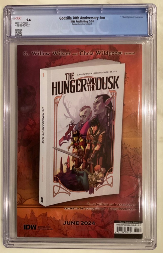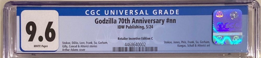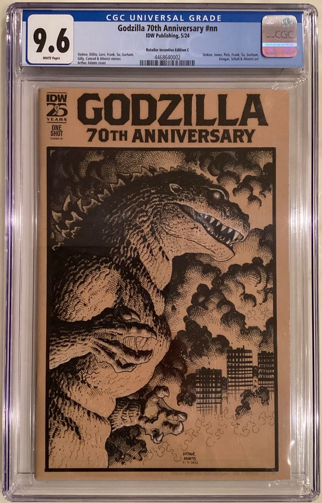 Celebrate the 70th anniversary of Godzilla with this stunning comic book edition. Featuring cover art by Arthur Adams, this Comic Book Retailer Incentive Edition C is a must-have for fans of the Modern Age (1992-Now) era of US Comics. The publication year is 2024, and the comic is certified by Certified Guaranty Company (CGC) with a grade of 9.6 Near Mint+, White Pages. This collectible item is perfect for those interested in Comics & Graphic Novels, Comic Books & Memorabilia, and Collectibles categories. The Godzilla 70th Anniversary series title is a great addition to any collection, and with its unique cover variant - C, it is sure to stand out. Don't miss your chance to own this rare edition. ONE OF ONLY 50 Books.