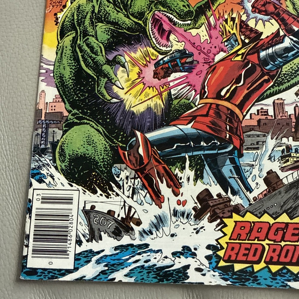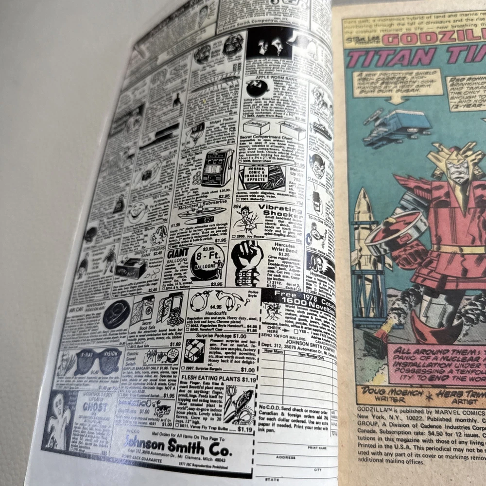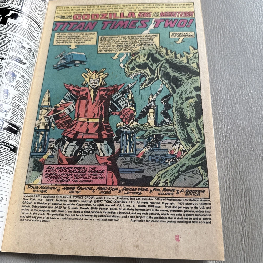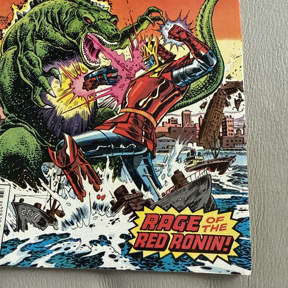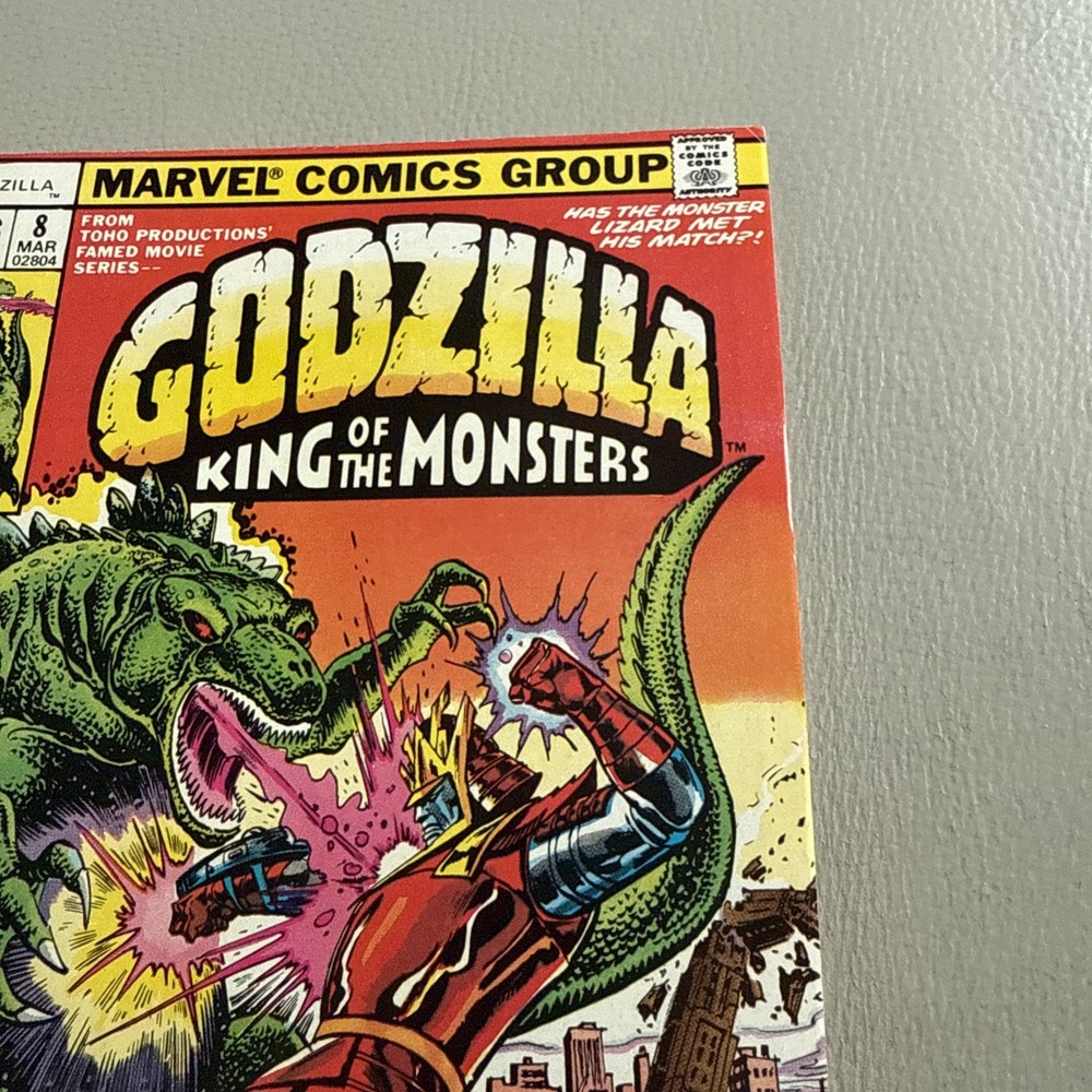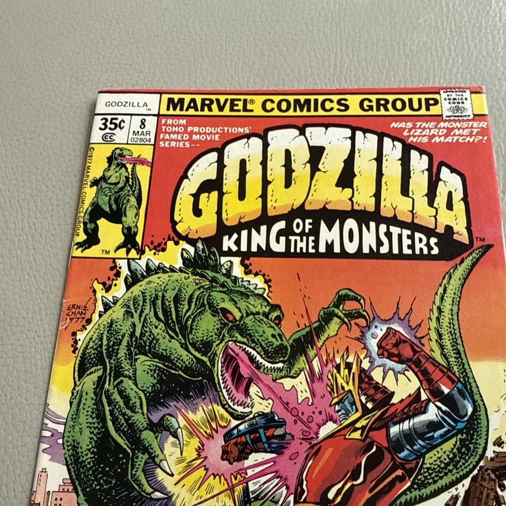 The product is a vintage Godzilla comic book issue #8 from Marvel Comics in 1977, featuring characters like Dum Dum Dugan, Gabe Jones, Godzilla, and Tamara Hashioka. The cover art was done by Ernie Chan, and the comic falls under the genre of science fiction in the Bronze Age era. It is a single issue in English, with a traditional US Comics style and color format. The comic is not signed or personalized and comes boarded for preservation. This collectible item is a piece of Marvel's universe and a must-have for fans of Godzilla and comic book enthusiasts.
