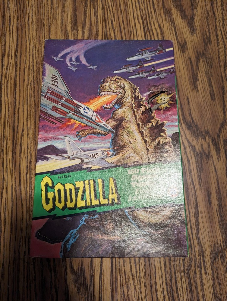 Godzilla "Air Attack" 150 Pc Jigsaw Puzzle HG Toys 458-04 1987 Vintage 10"x14" From a well-kept collection of puzzles. Box and pieces are pictured. Box has a hole. Counted 150 pieces but not guaranteed complete, as-is.