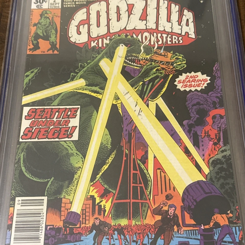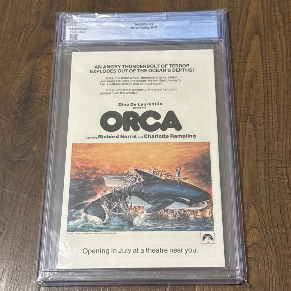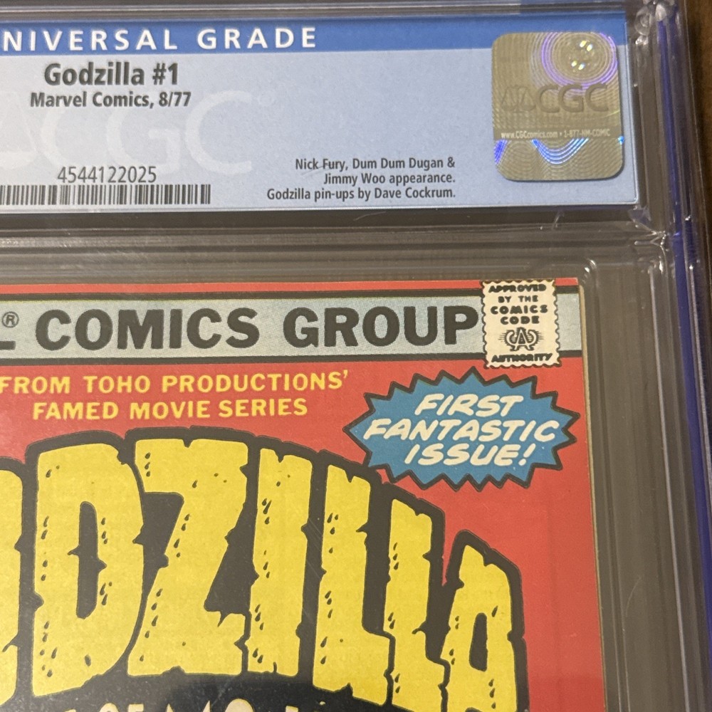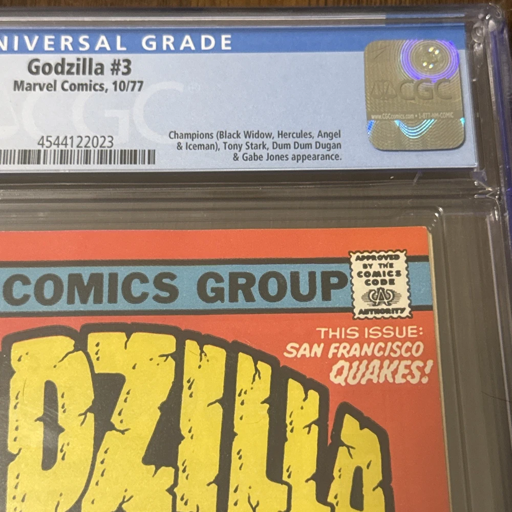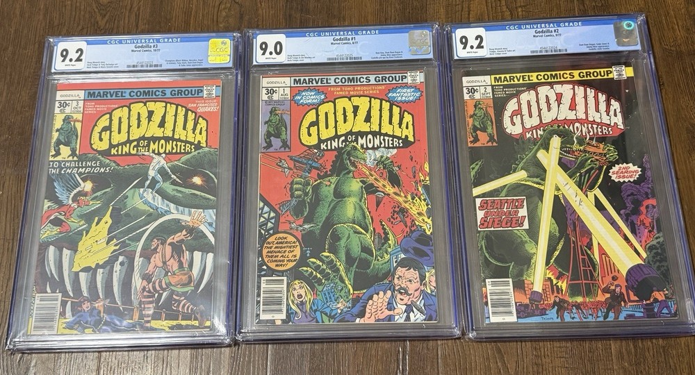 This is a lot of three copies of the first 3 issues of Godzilla comic book from 1977, all of which have been professionally graded by the Certified Collectors Alliance (CGC). The comics are in excellent condition, with no writing or marks on the pages, and are a must-have for any serious collector of US comics. The lot includes the first issue of the original Godzilla series, which features the iconic monster in all his glory. The comics are part of the Tradition of US Comics and are perfect for fans of the character. The series title is Godzilla and the issue number is 1. This is a rare opportunity to own a piece of comic book history, so don't miss out on this chance to add these valuable comics to your collection.