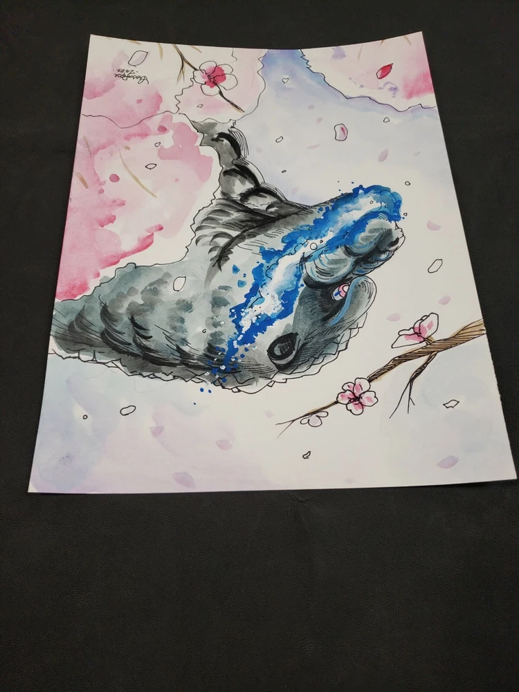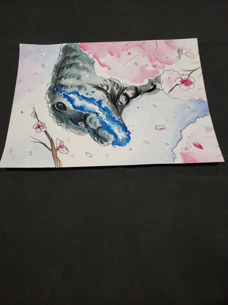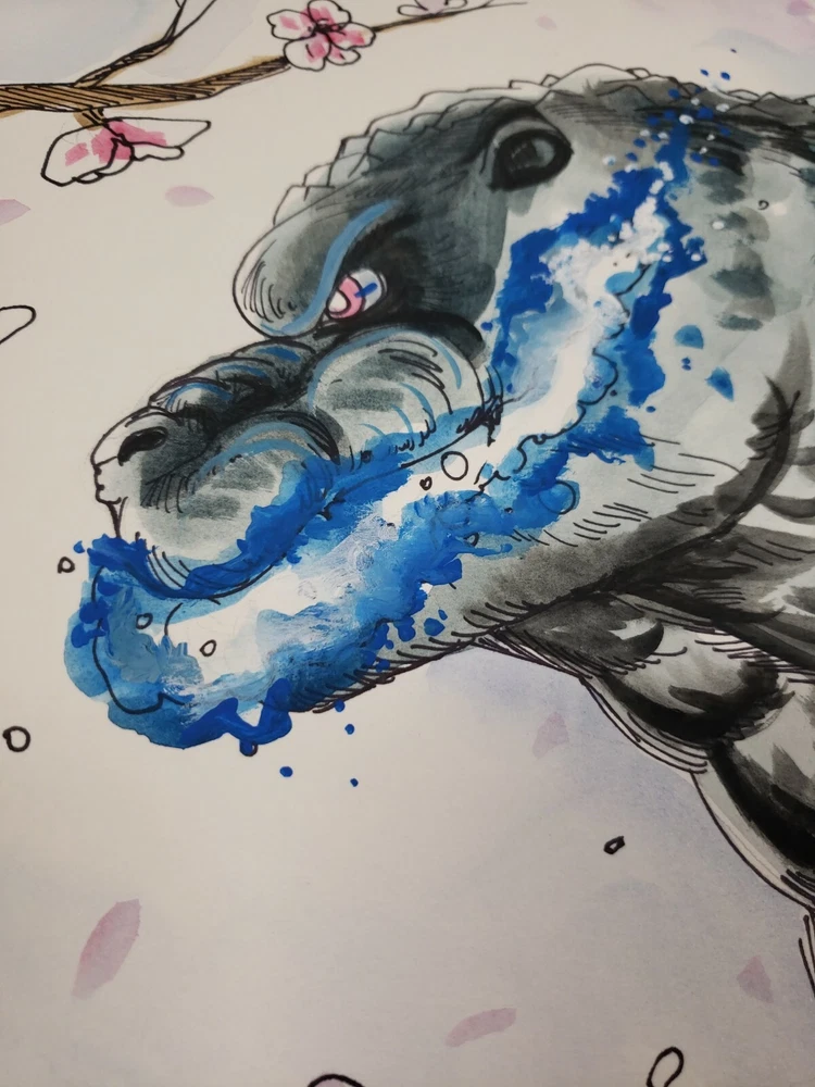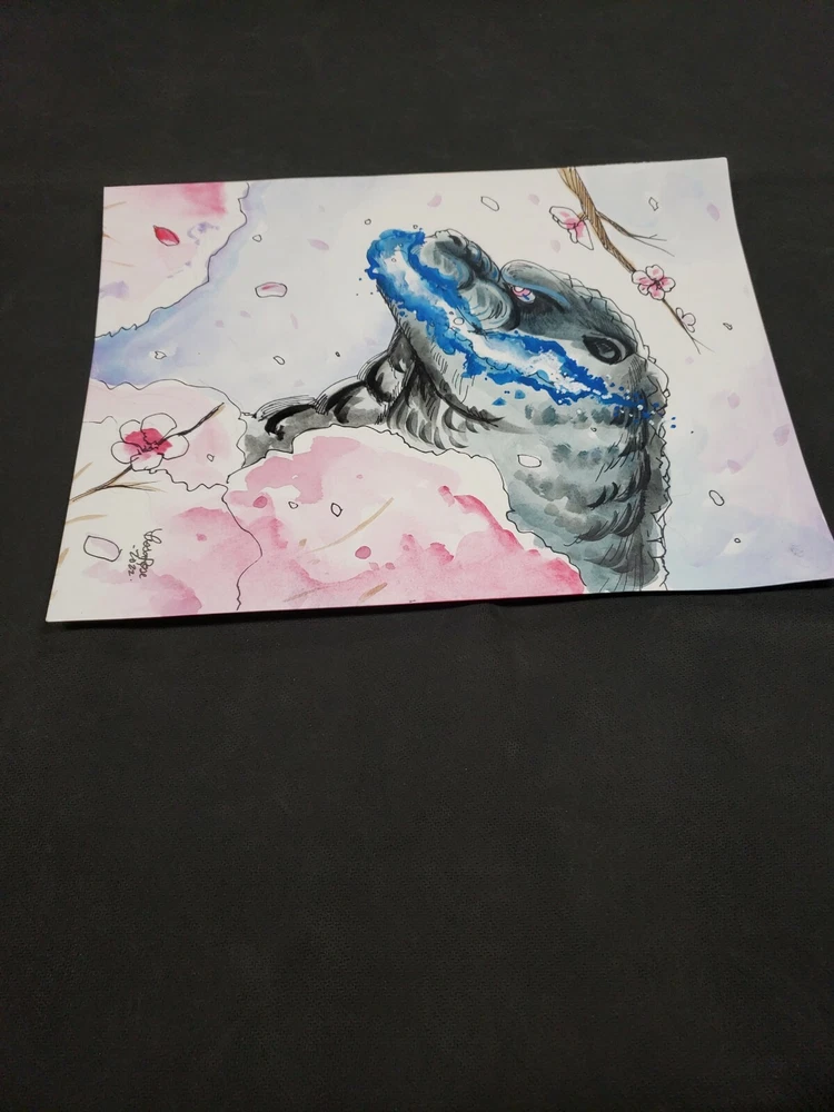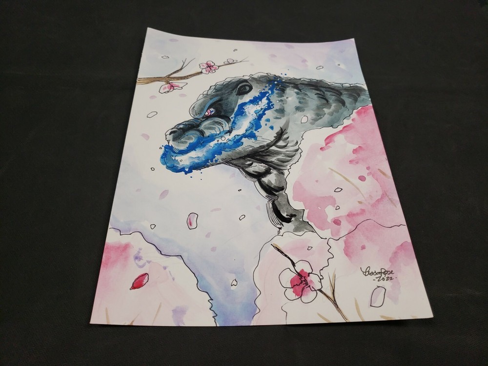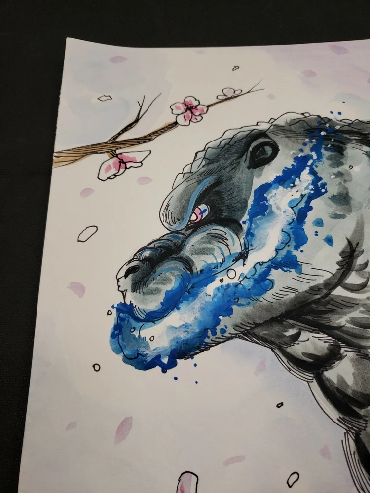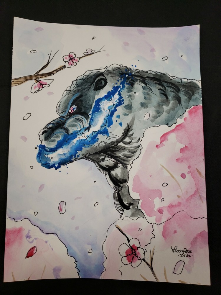 Tessa Rose Original painting Godzilla in Cherry Blossoms Godzilla Art 9x12 acrylic paint and markers on watercolor paper Shipped with USPS first class...