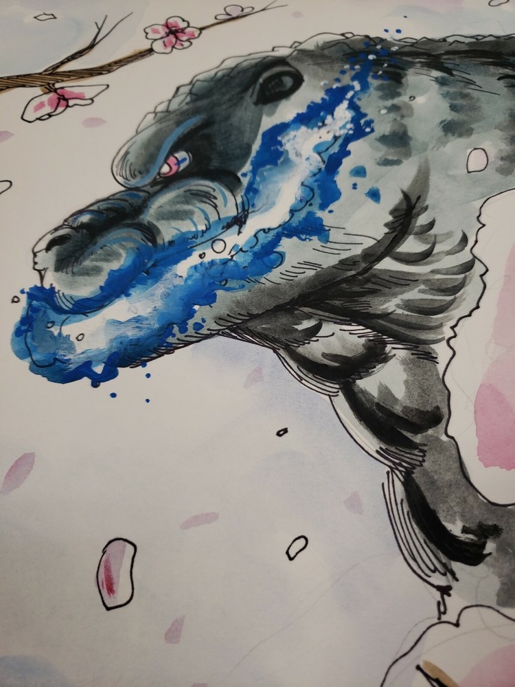 Tessa Rose Original painting Godzilla in Cherry Blossoms Godzilla Art 9x12 acrylic paint and markers on watercolor paper Shipped with USPS first class