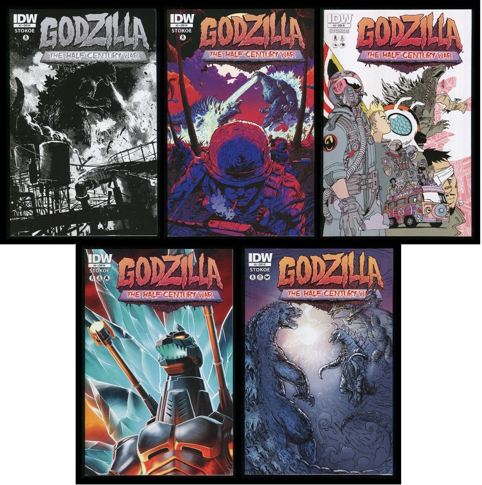 Godzilla: The Half-Century War RI Variant Comics Lot Featuring the Complete Retailer Incentive Limited 1 for 10 Variant Covers Collection! Awesome! ! Writer: James Stokoe Artist: James Stokoe Colorists: James Stokoe w/ Heather Breckel Letterer: James Stokoe Editor: Bobby Curnow RI Variant Cover #1 by: Frank Teran RI Variant Cover #2 by: Sheldon Vella RI Variant Cover #3 by: Brandon Graham RI Variant Cover #4 by: John Kantz RI Variant Cover #5 by: Simon Roy Story/Spoilers: In issue #1, "Introducing a new and exciting look at Godzilla's reign of destruction, courtesy of Orc Stain creator James Stokoe! The year is 1954 and Lieutnant Ota Murakami is on hand when Godzilla makes first landfall in Japan. Along with his pal Kentaro, Ota makes a desperate gamble to save lives... and in the process begins an obsession with the King of the Monsters that lasts fifty years! Don't miss the first decade in a tale of a lifetime!" In the year 1954, Ota Murakami, a Japanese lieutenant in the J.S.D.F., and his best friend Kentaro, are leading a tank battalion deep into the heart of Tokyo during Godzilla's first attack on Tokyo. Upon encountering Godzilla, Ota orders all the tanks in the battalion to open fire on him, but their attack merely alerts the giant monster to their presence, and he quickly destroys all of the tanks with his atomic breath, save for Ota's, which has its radio antenna broken. Kentaro fixes the radio and the two get word that Godzilla is heading for a massive group of civilians trying to evacuate. Springing into action, Ota and Kentaro manage to catch up with Godzilla moments before he reaches the evacuees and distract him with a shot to the face. Godzilla proceeds to give chase to the tank throughout the city, and he eventually falls victim to an artillery strike. However, that too also proves futile as Godzilla quickly recovers from the attack and gives chase to the tank yet again. With the tank's engine almost broken, Kentaro manages to veer it into a canal as Godzilla marches away into the sea. Ota gets a broken arm and is sent to hospital. He breaks out a few days later and watches with Ken as Godzilla is 'killed' by the Oxygen Destroyer. A few months later, Ota and Kentaro are given an offer by a Colonel Schooler to hunt down Godzilla, who is seemingly alive and is wreaking chaos across the Pacific. Ota accepts, and so does Kentaro. Featuring the Retailer Incentive Limited 1 for 10 Variant Cover #1 by Frank Teran! Awesome!! Next in issue #2, "The year is 1967 and Godzilla is on the move... to Vietnam! With a war underway, Godzilla is the last thing the country needs. Lieutenant Murakami follows Godzilla to try out some new tech on the monster, but a super-sized foe named Anguirus might just be the most effective countermeasure. It's a rumble in the jungle, don't miss it!" It's been thirteen years since Godzilla first made landfall at Japan and Ota Murakami's first encounter with the King of Monsters. Ota is now a seasoned veteran of the A.M.F., an international organization dedicated to eradicating Godzilla. Godzilla has mysteriously swung from his usual territory in the Northwestern Pacific and is headed straight towards Indochina, where the Vietnam War is already in full swing. The A.M.F., blocked from entering the peninsula through North Vietnam, is forced to stop Godzilla north of Saigon. At the A.M.F.'s makeshift command post, an American general Carson working with the A.M.F. Carson plans to lead Godzilla into a mined bog where he hopes that Godzilla will be stuck long enough until a flight of B-52 Superfortress bombers drop their loads of bombs on the monster. Colonel Schooler tries to tell Carson the futility of such an attack, but is ignored by Carson, who is arrogant enough to claim that "There isn't a creature that walks this Earth that can survive what we're about to unleash on that valley!" Meanwhile, a battery of maser cannons is set on a hilltop by the E.D.F.'s eccentric Doc Randall, who claims that the said maser cannons can blast through a half-mile of solid granite. Kentaro is sent with Randall to operate the maser batteries. Schooler then has a discussion with Ota on why Godzilla would switch his territory so quickly. Ota can't think of anything, but guesses that Godzilla is chasing something. Acting on a hunch, Schooler leaves the command post via helicopter and leaves Ota in charge. Soon enough, Godzilla arrives and gets distracted by several tanks and helicopters, and soon enough, bumbles into mines that several engineers had placed two days prior. He then comes into maser cannon range, and they open fire. However, the action is soon cut short when Viet Cong soldiers scramble out of a spider hole, and the "hilltop" where the maser battery is on turns out to be Anguirus, who is awakening. Most of the maser batteries are lost. Meanwhile, Godzilla notices Anguirus and the two engage in a fight. The fight drags on for a while until Anguirus flees. This gives Ken and Randall the opportunity they need to hit Godzilla with the remaining masers. Unfortunately, the bombers that Carson had ordered earlier arrive and drop their payloads, obscuring the view for the masers and ruining the best possible chance for the A.M.F. to defeat Godzilla. Then, as Ota laments over the situation, Godzilla suddenly turns for the sea. Meanwhile, Schooler is revealed to have found the reason of Godzilla's mysterious course change: a Psionic Transmitter. Featuring the Retailer Incentive Limited 1 for 10 Variant Cover #2 by Sheldon Vella! Awesome!! Next in issue #3, "Welcome to Ghana, 1975. The criminal underworld has found a way to summon monsters and they've chosen the African country as a trial run for the first ever monster mash-up! A horde of kaiju are on the way and different military teams, each specifically trained to thwart each monster's capabilities, enter the fray. During the chaos, Lieutenant Ota stumbles upon the source of the chaos!" It's the year 1975. Since the A.M.F.'s 