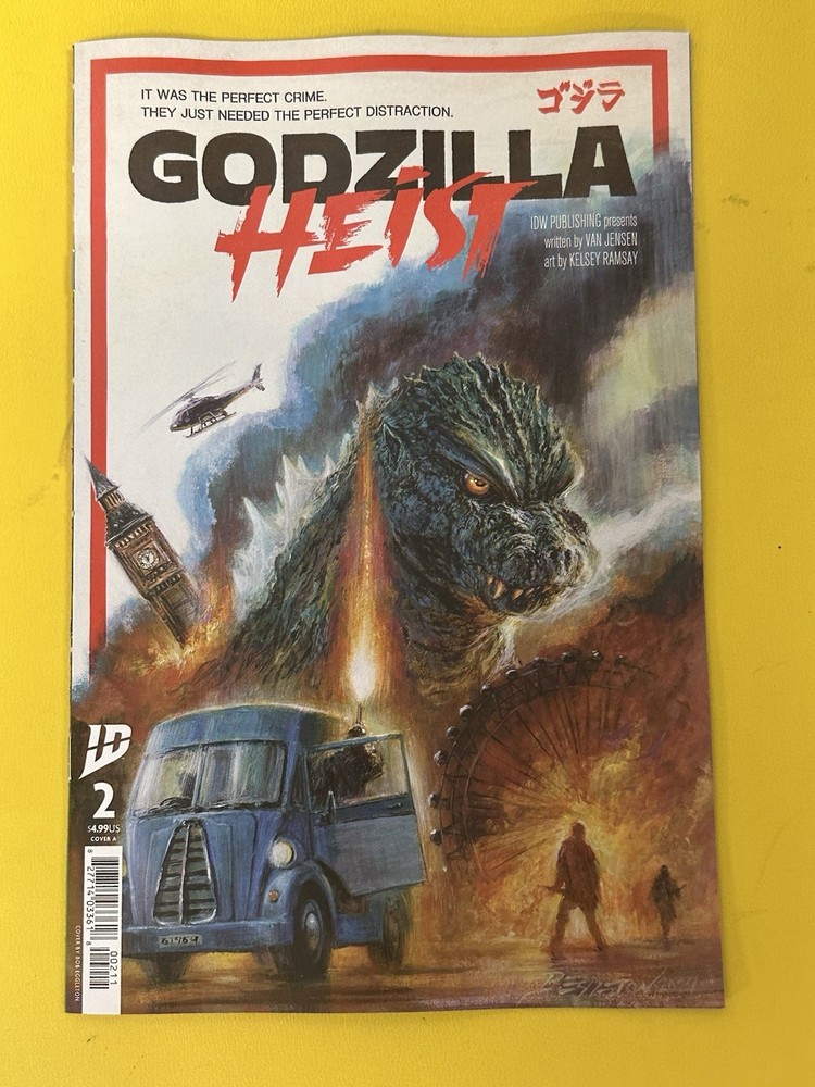 The Godzilla Heist #2 comic book is a single issue cover variant featuring the iconic character Godzilla. Published by IDW Publishing in 2025, this modern age comic is in English and includes various artists and writers. The comic is boarded and intended for a general audience, making it a collectible item for fans of the Godzilla universe.