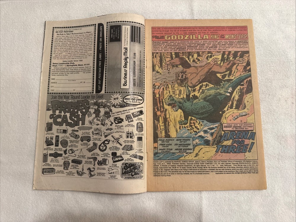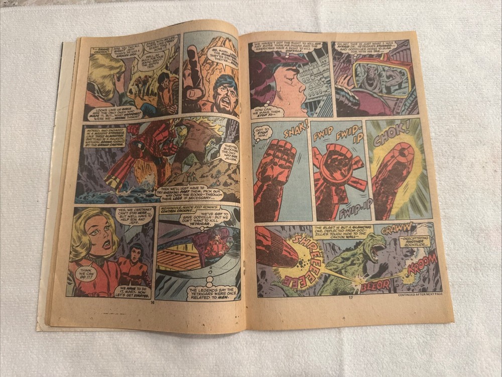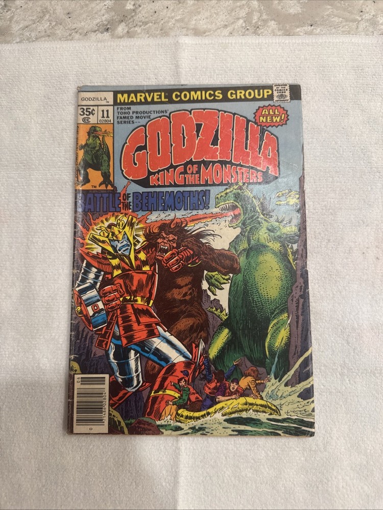 Mid grade The product is a comic book titled "Godzilla King of Monsters #11 Battle of the Behemoths," part of the "Godzilla" series by Marvel Comics. Released in June 1978 during the Bronze Age era of US Comics, this issue features the character Godzilla in a monster genre story. The comic is written by Doug Moench and illustrated by Herb Trimpe, showcasing a battle between various behemoth creatures. It is a collectible item within the realm of comic books and memorabilia, appealing to fans of Godzilla and classic Marvel Comics.