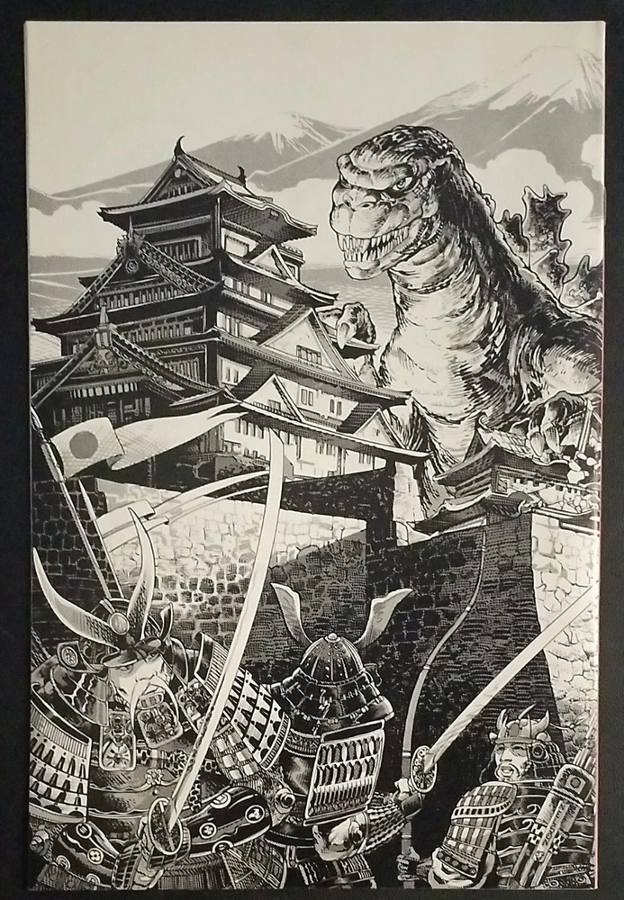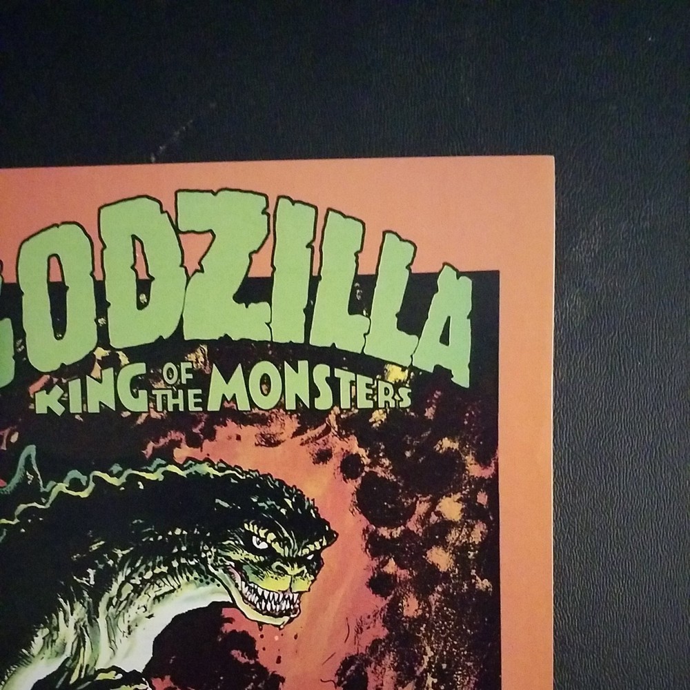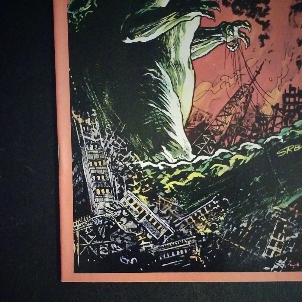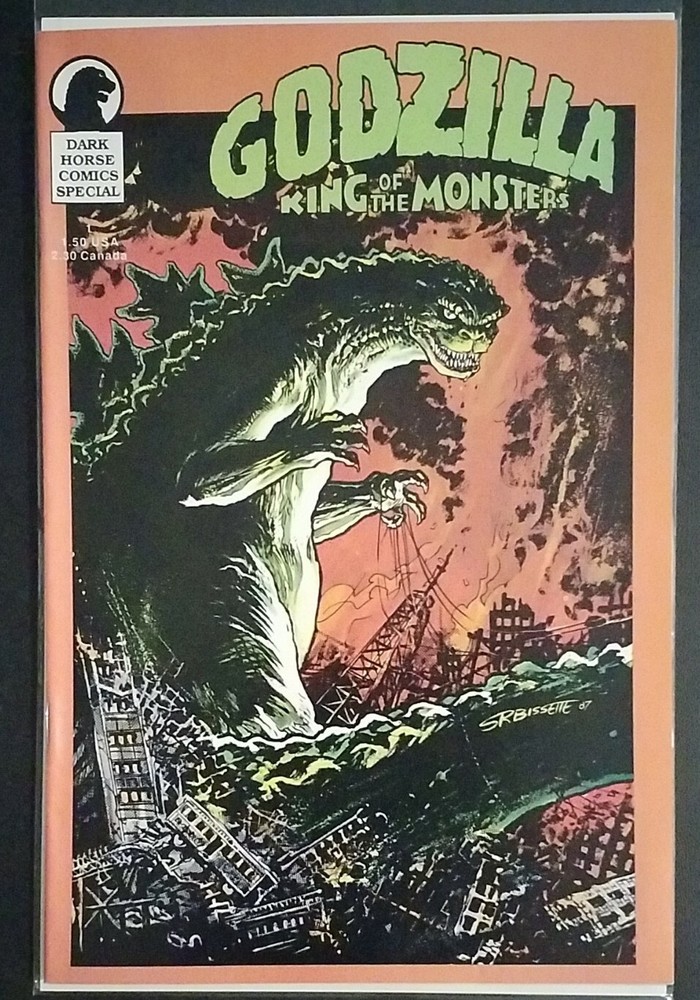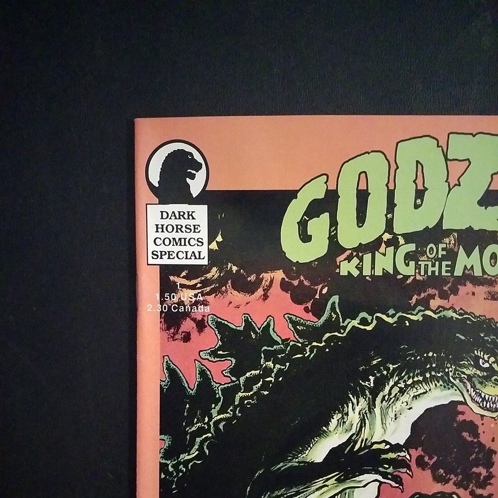Godzilla King of the Monsters #1 Dark Horse Comics 1987. Written by Randy Stradley and Steve Bissette. Art by Steve Bissette, Ron Randall, Art Nichols and Tony Salmons. Cover by Steve Bissette. The BIGGEST character of all time is back--like you've never seen him before! Plus, beginning in this issue, a series of full page pin-ups by Giffen, Moore, Vess, Vietch, Yeates, Gulacy, Chadwick, Warner, Eastman & Laird, Salmons and others! B&W. Cover price $1.50.