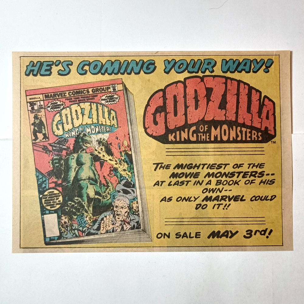 Hello! This is a print ad for the Marvel Godzilla: King of the Monsters comic book series. It was trimmed from a 1977 comic book page and measures 6 5/16 x 4 9/16". This vintage comic book ad will be tanned. Please check the photos for details. Shipping will automatically combine if items are added to the shopping cart. For multiple Best Offers, a shipping adjustment will be issued as a refund. Feel free to contact me with any questions. Thank you for looking!