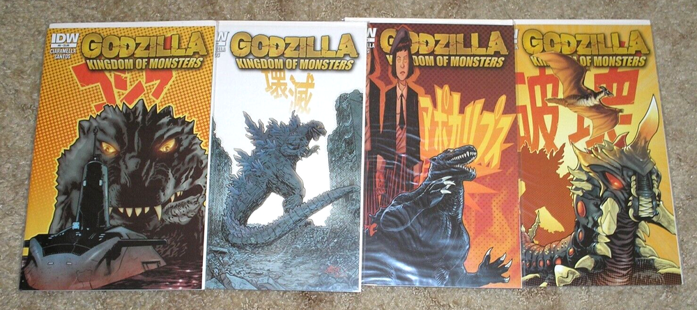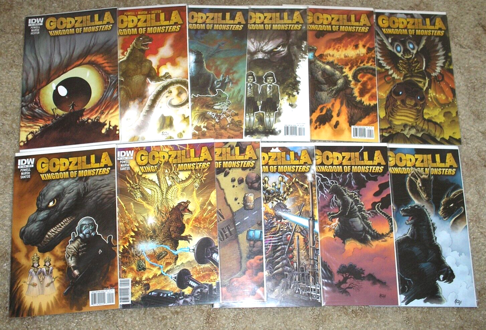 This lot contains Godzilla Kingdom of Monsters 1-12, with multiple versions of some issues.1B (F/VF), 1RI-A (VF/NM), 3A (F, due to corner stress upper right), 4A (F/VF), 4RI (F/VF), 5A, 5B (VF/NM), 6A, 6B (VF/NM), 7-12 (VF/NM). Shipping is $18.00 for USPS Flat Rate Box (includes $100.00 insurance). U.S. Bidders only, please.