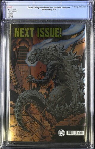 This auction is for Godzilla Kingdom of Monsters #1 variant i n CGC 9.8 with a new case condition. This week we are selling an incredible collection including Amazing Spider-man , Silver Surfer, Dr. Strange, X-men, Iron Man, Hulk, Fantastic Four, Black Panther, Batman, CGC books and many other 1st appearance key issues. You are sure to find something you are looking for this week. Bonus Offer! I will add a bonus comic book for every 10 auctions you pay for on the same invoice this week. Our Shipping rates are: USA: 5 dollar flat rate shipping with no limit, multiple comic lots have a charge and additional combined lots are half price. Canada: 16 Dollars for the 1st comic and 1.50 each after that. International: 18 dollars for the 1st comic and 1.50 each after that. CGC books are 11.99 flat rate in the USA, 24 bucks and 12 combined for Canada and 28 bucks and 14 combined for international. Feel free to ask questions. I guarantee superfast Domestic shipping! ...to open their eyes...that they may receive forgiveness of sins and a place among those who are sanctified by faith in me. Acts 26:18