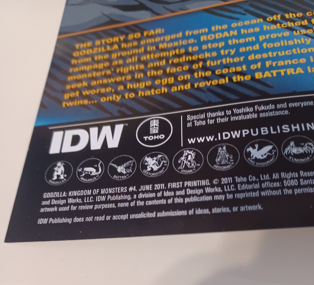 Godzilla Kingdom of Monsters Comic #4, Cover B, IDW Publishing (June 2011) France is in danger when the mysterious egg that washes ashore begins to hatch, but should the military be worried about what's inside the egg or those creepy kids who found it? Also, a community of monks has a religious experience of the 3-headed variety. And all the while, Godzilla seems hell-bent on coming to America...but hasn't Anguirus already claimed it as his turf? 1 in 5 variant cover. Story: Eric Powell & Tracy Marsh Art: Phil Hester, Eric Powell, and Jeff Zornow Cover: Jeff Zornow Duties and Taxes: For direct shipping (not through eBay GSP), the import duties, taxes, and brokerage fees are not included in the product price or shipping and handling cost and it will be collected upon delivery from the carriers for certain packages. These charges are recipient’s responsibility as we are only charging the transportation fee for the packages. You may check with your country’s customs office to determine what these additional costs will be