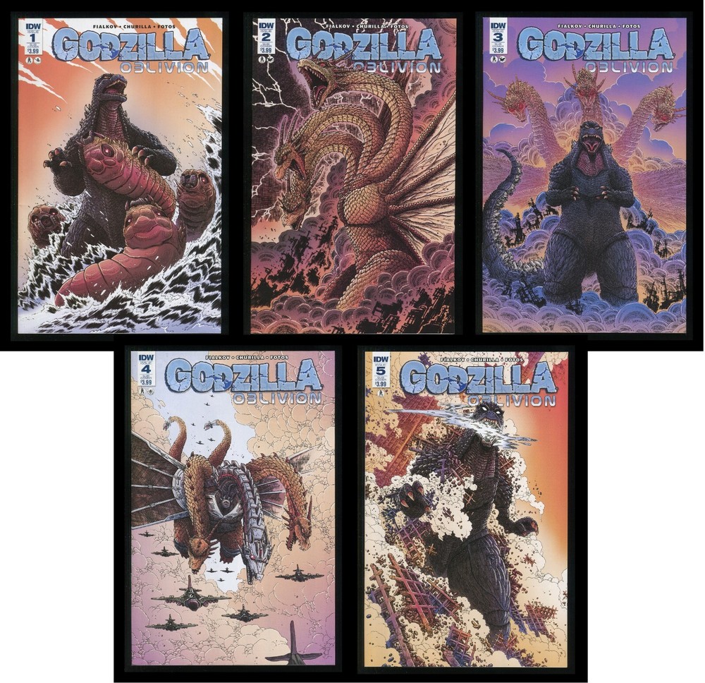 Godzilla: Oblivion Subscription Variant Comics Lot Featuring the Complete Subscription Variant “Godzilla” Cover Art Collection by James Stokoe. Awesome!! Writer: Joshua Fialkov Artist: Brian Churilla Colorist: Jay Fotos Letterer: Chris Mowry Editor: Bobby Curnow All Subscription Variant Covers by: James Stokoe It’s the end of the world as we know it in Godzilla: Oblivion, the stunning five-part presentation from IDW Publishing. As monsters swarm from a ravaged alternative dimension to destroy the world! Battles rage across this Earth that has never known monsters, the foolhardy experiments of the scientists and the military to visit other dimensions have now doomed all civilization, can there be any possible hope of escape now? Get ready for the most epic Godzilla battle of them all!... And if that were not enough, how about a worldwide nuclear strike about to be launched!! Featuring the always amazing "Godzilla Cover Art" by James Stokoe. Awesome!! Story/Spoilers: In issue #1Sub, In the laboratory of Dr. Eli Talbert, his assistant Ridley informs him that the interdimensional portal they had been working on is finally completed. Just then, Talbert's employer Ms. Yamada enters the laboratory and tells Talbert to turn on the portal. Talbert warns Ms. Yamada that the portal is a completely untested technology that requires further testing, but she tells him that his only job was to build the portal, and that job is now completed. Talbert activates the portal, and Ms. Yamada and her bodyguards go through, with Talbert close behind. On the other side of the portal, they find themselves in the ruins of a city. As they wander through the ruins, the bodyguards notice something fly past them and open fire at it. One bodyguard walks towards it, only for the creature to reveal itself as a tiny Rodan, who kills the bodyguard with its uranium heat beam. The group suddenly hears a voice ordering them to return to a shelter as Kiryu arrives and attacks the Rodan. As Kiryu blasts the Rodan with a laser beam, several more Rodans descend and swarm the machine. The humans start to run away, but one Rodan catches up with them. Before the Rodan can carry off one of the bodyguards, it is blasted by a soldier wielding a laser gun. The soldier and the rest of his men load Talbert, Yamada and the bodyguards onto a truck and drive away. The soldier chastises Talbert and Ms. Yamada for wandering in the area most populated by giant monsters. Talbert asks what happened to the city, only for the soldier to incredulously ask if he is kidding. Ms. Yamada explains that they are "visitors" to the city, and that their transport broke down. The soldier then explains that the giant monsters began appearing about ten years ago and terrorized the Earth, only for a much more powerful monster to appear and end their reign of terror. He orders the shades on the truck to be lowered, and shows them the monster in question: Godzilla. The soldier says that Godzilla keeps the other monsters in check and prevents them from growing to full size, and that he and his men do whatever it takes to keep Godzilla happy. Talbert tells them to turn the truck around, and one of Ms. Yamada's men holds the soldier at gunpoint. The truck drops them off, near a battle between two Rodans and two Mothra larvae. As they run back to the portal, they are pursued by a huge three-headed dragon, which a bodyguard says is called King Ghidorah by the soldiers. Talbert, Ms. Yamada and her remaining bodyguards go through the portal, but before it can close King Ghidorah travels through it as well. Next in issue #2Sub, Two weeks after King Ghidorah emerged from Dr. Talbert's lab in Cambridge, Massachusetts, the eastern United States has been completely devastated, with the cities of Boston, New York, Philadelphia, and Washington D.C. having already fallen and all efforts by the U.S. military, NATO, and the United Nations having failed. A general is interviewed on a news program, where he expresses his belief that there is no way to stop King Ghidorah and that the end times have come. Dr. Talbert is viewing the program from a prison cell, and turns it off once the general begins to rant about how humanity is doomed. A guard enters Talbert's cell and escorts him to an office, where Ms. Yamada is talking to another general. The general informs the two of them that the government has developed a desperate plan to stop King Ghidorah. The interdimensional portal has been rebuilt on a much larger scale, and Talbert and Ms. Yamada are to be sent back into the alternate dimension to find something to stop King Ghidorah. The two are airlifted to the new portal, where Dr. Talbert encounters his former assistant, Ridley, who has been tasked with rebuilding the portal. Talbert tells Ridley to close the portal if anything worse than King Ghidorah comes through, to which she readily agrees. Talbert and Yamada are then assigned to a team of soldiers, led by a soldier named Weinstein. The portal is activated, and the team goes through. On the other side, they see Godzilla roaming through the city. Talbert runs into the street, right in front of an armored vehicle. Drayer, the soldier Talbert and Ms. Yamada had met in this dimension before, exits and discusses the situation. Talbert asks to borrow some of their technology to stop King Ghidorah, but Drayer says their technology was useless against King Ghidorah, and only Godzilla could stop him. Talbert and Yamada enter an armored vehicle and activate the siren, causing Godzilla to give chase. After dodging Godzilla's atomic breath, the vehicle passes through the portal. A few seconds later, Godzilla comes through the portal as well. Ridley asks what they will do now, and Ms. Yamada answers that they will make Godzilla fight King Ghidorah. Talbert then remarks that he has a bad feeling about this plan. Next in issue #3Sub, Godzilla and King Ghidorah are battling in Washington D.C. While their conflict rages, Dr. Talbert, Rid