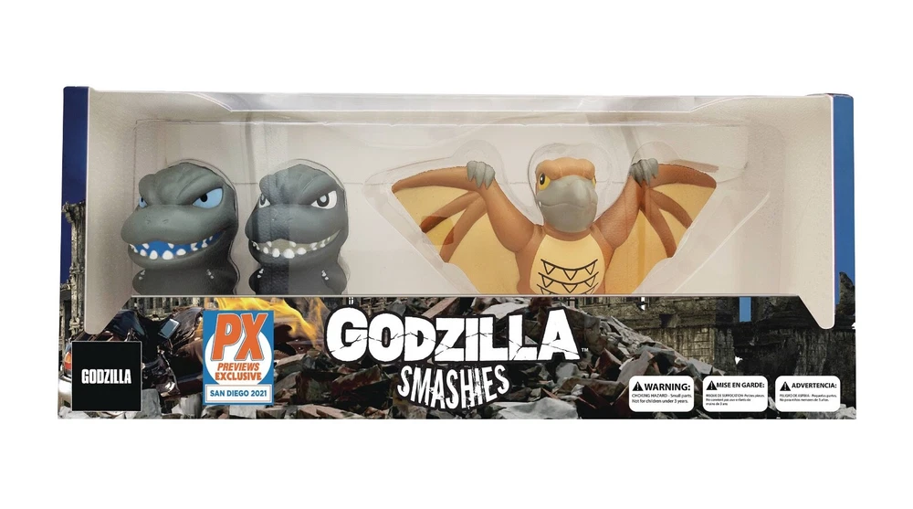From Surreal Entertainment. This special San Diego Exclusive collector display window box includes three slo-rise foam SMASHIES! Collect Atomic Godzilla winding up for a blast of his radioactive fire breath, Black and White Godzilla as seen in the original 1954 Gojira and 1955's Godzilla Raids Again , and an exclusive SMASHIE of Rodan , with an impressive 7 1/2" wingspan. Rodan is exclusive to this limited edition set, and not available in any other assortment! Each character is 4" tall and made of slo-rise "squishy" foam, so you can SMASH these kaiju and watch as they slowly regenerate back to their original form! Limited to 2000 Pieces.