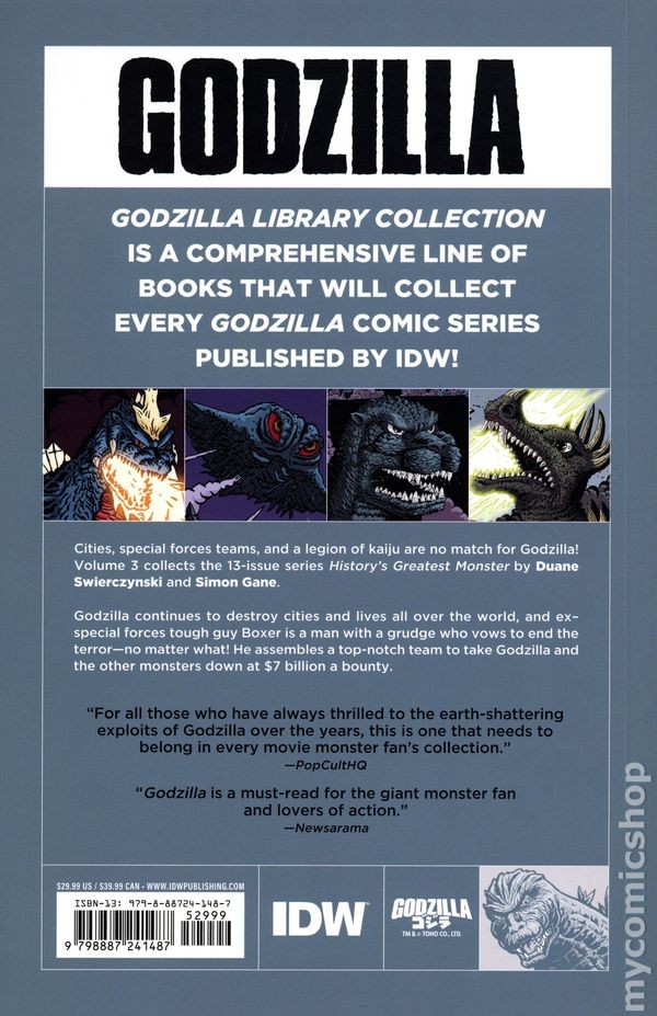 Menu Categories Featured Comics New Comics Comic Book Value Packs Key Comics & First Appearances Pre-Code Horror Comics Good Girl Art Comics Promotional Comics Comics Pre-1940 Comics 1940s Comics 1950s Comics 1960s Comics 1970s Comics 1980s Comics 1990s Comics 2000s Comics 2010-Curent Other Comics Graphic Novels, Books Fanzines Vintage Paperbacks Pulps and Digests Men's Adventure Non-comic Magazines Godzilla TPB Library Collection #3-1ST NM 2024 Stock Image Grade NM Year 2024 Publisher IDW Publishing Description Volume 3 - 1st printing. Collects Godzilla (2012 IDW) Ongoing #1-13. Written by Duane Swierczynski. Art by Simon Gane and Dave Wachter. Cover by Dave Wachter. Cities, special forces teams, and a legion of kaiju are no match for... Godzilla! The Godzilla Library Collection is a comprehensive line of books that will collect every comic series by IDW! Volume 3 collects the 13-issue series History's Greatest Monster by Duane Swierczynski and Simon Gane. Godzilla continues to destroy cities and lives all over the world, and ex-special forces tough guy Boxer is a man with a grudge who vows to end the terror-no matter what! He assembles a top-notch team to take Godzilla and the other monsters down at $7 billion a bounty. Softcover, 328 pages, full color. Stock images The images shown in this listing are stock images provided to help you identify the item, but do not show the specific item being offered, nor do they represent the grade and condition of the item being offered. Grading & Packing We take pride in our accurate, consistent grading. You can be confident in receiving a well-graded comic when ordering from us. We understand that condition is important to collectors. We pack your comics with professional care and high-quality packaging to insure your purchase reaches you safely. About Us We opened our first comic retail store in 1977 and operated a chain of eight comic book stores in the 80s, 90s, and 2000s before going online-only. We are the world's largest comic book seller and the biggest and most trusted comic seller on eBay with over 3.6 million comics sold. We Buy & Consign We buy tens of thousands of comics every month from collections large and small, old and new. We also accept consignments and will get your comics listed on eBay for you. Check out our website for more info. Copyright © 2025 MyComicShop & Lone Star Comics. All rights reserved.