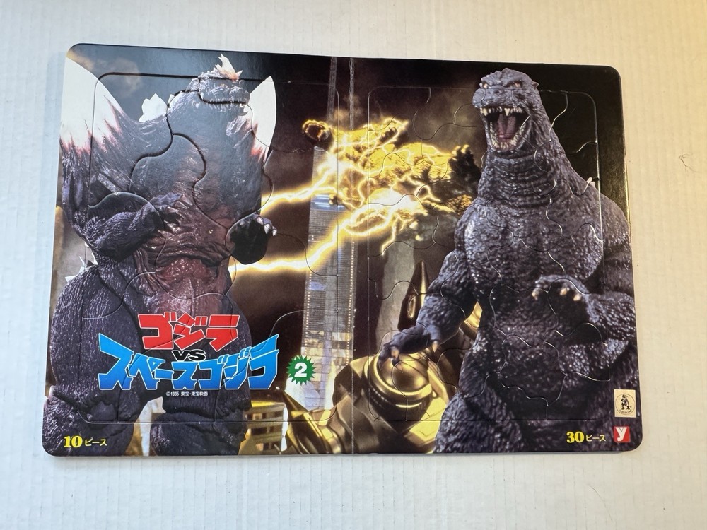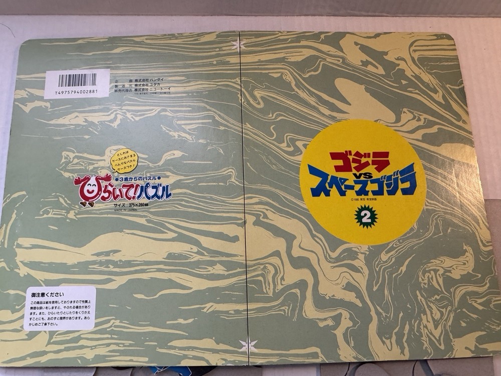 Slip cover is dirty but puzzle is in very good condition. Children’s style board puzzle, easier (fewer pieces) on the left than right.