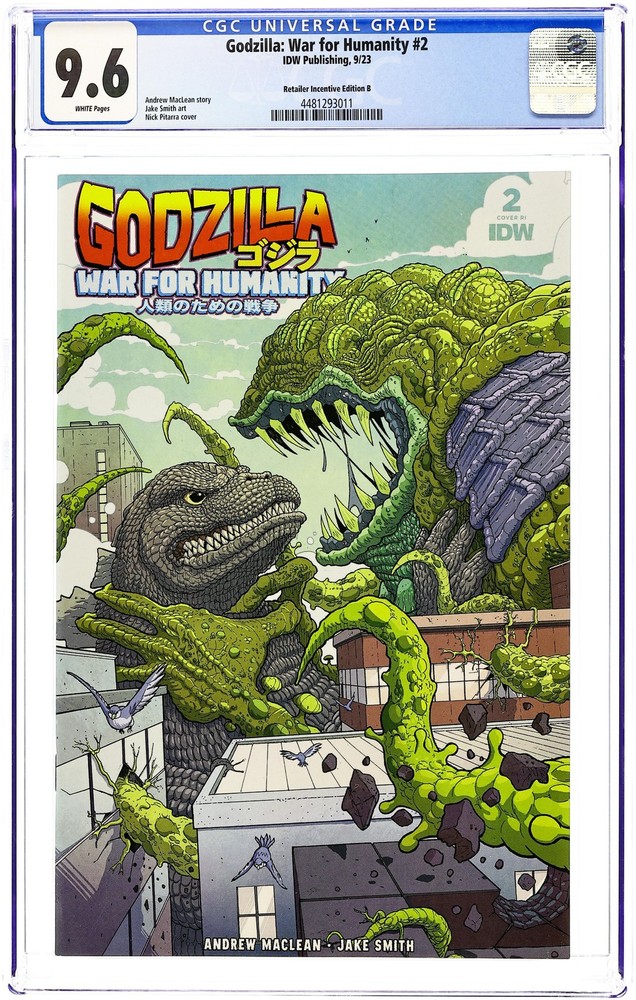 Menu Categories Featured Comics New Comics Comic Book Value Packs Key Comics & First Appearances Pre-Code Horror Comics Good Girl Art Comics Promotional Comics Comics Pre-1940 Comics 1940s Comics 1950s Comics 1960s Comics 1970s Comics 1980s Comics 1990s Comics 2000s Comics 2010-Curent Other Comics Graphic Novels, Books Fanzines Vintage Paperbacks Pulps and Digests Men's Adventure Non-comic Magazines Godzilla War for Humanity #2RIB CGC 9.6 2023 4481293011 Grade CGC 9.6 Page Quality White Year 2023 Publisher IDW Publishing Retailer Incentive Edition B Any CGC case may have minor imperfections including Newton rings, scuffs, standard surface wear, or minor cracks. CGC considers these defects acceptable, as do we. If there is any significant damage to the slab it will be noted in our description, and we will not list any slabbed comics with a damaged case that compromises the integrity of the grade. Description Limited 1 for 25 Retailer Incentive Variant Cover. Written by Andrew MacLean. Art by Jake Smith. Cover by Nick Pitarra. The menace of Zoospora spreads! The new monster on the block is going after Anguirus and the only hope against either is a robot called MOGUERA! The only hope, that is, unless Drs. Honda and Wiggum can find out any information about this new threat from…the Voice! And where is Godzilla?! 28 pages, full color. This item is a consignment This item is a consignment, which means that the price has been set by the consignor rather than by MyComicShop. It is located at our headquarters and ships just as quickly as everything else we carry. Grading & Packing We take pride in our accurate, consistent grading. You can be confident in receiving a well-graded comic when ordering from us. We understand that condition is important to collectors. We pack your comics with professional care and high-quality packaging to insure your purchase reaches you safely. About Us We opened our first comic retail store in 1977 and operated a chain of eight comic book stores in the 80s, 90s, and 2000s before going online-only. We are the world's largest comic book seller and the biggest and most trusted comic seller on eBay with over 3.6 million comics sold. We Buy & Consign We buy tens of thousands of comics every month from collections large and small, old and new. We also accept consignments and will get your comics listed on eBay for you. Check out our website for more info. Copyright © 2025 MyComicShop & Lone Star Comics. All rights reserved.