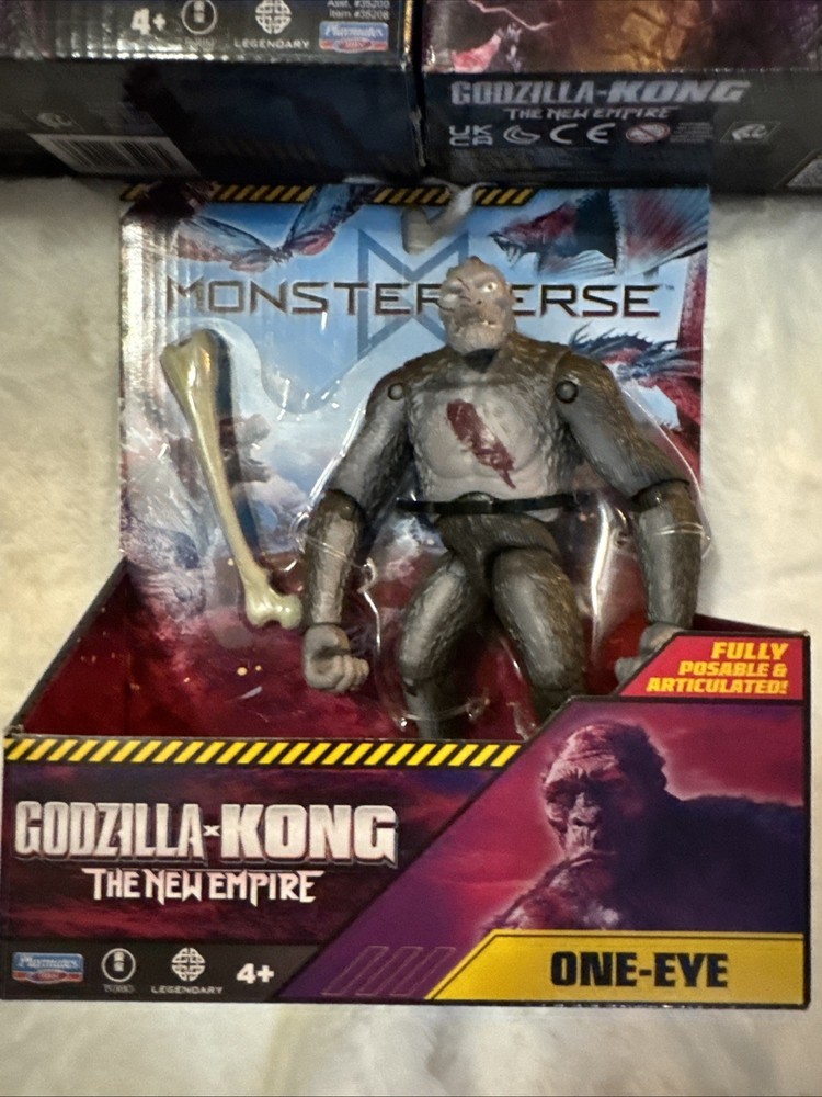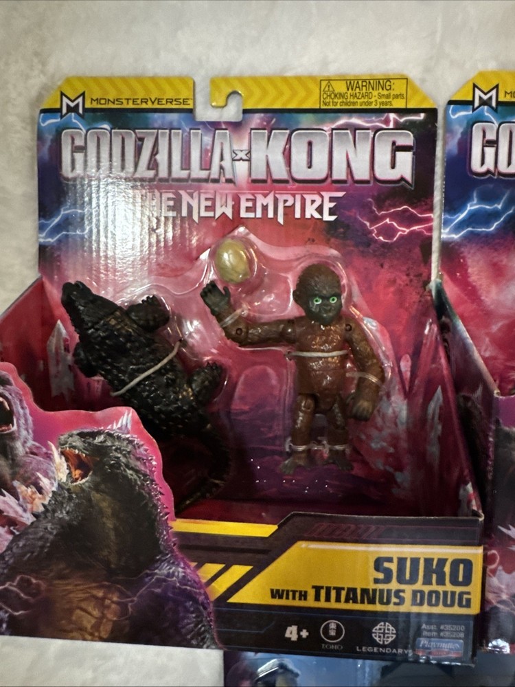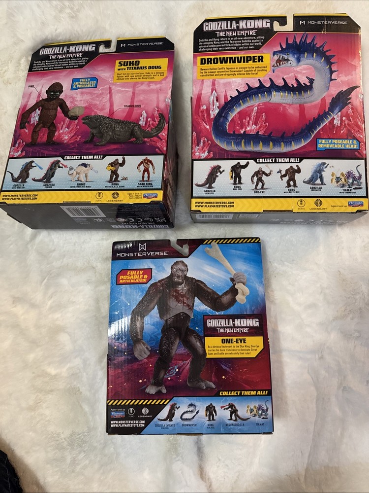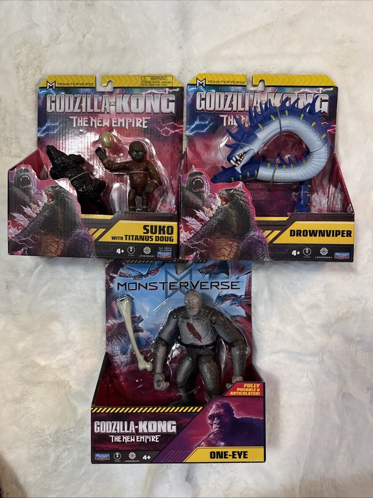 The product is a set of three action figures from the Godzilla X Kong New Empire series, featuring characters such as Suko, Titanus Doug, Drownviper, and One-Eye. These figures are made of plastic and are part of the Monsterverse Godzilla X Kong New Empire collection. They are based on the Godzilla vs. Kong movie and TV show, with a colorful multicolor design and a 1:12 scale. The figures are manufactured in 2023 by Playmates Toys, and are suitable for ages 4 and up. This mixed lot of action figures would be a great addition for fans of the Godzilla franchise.