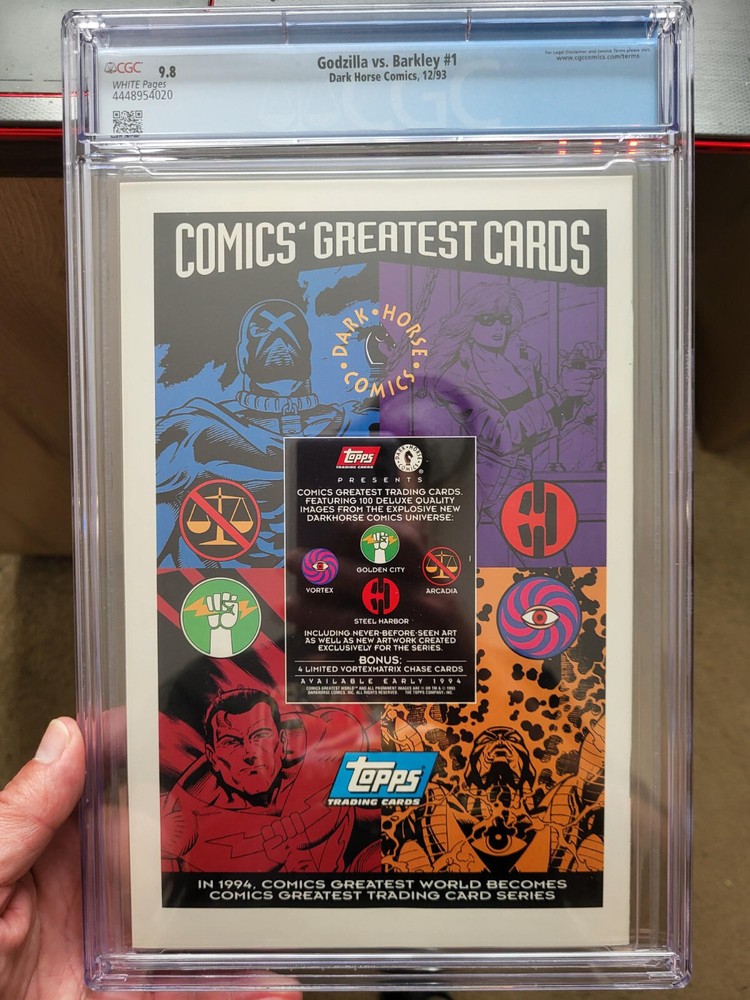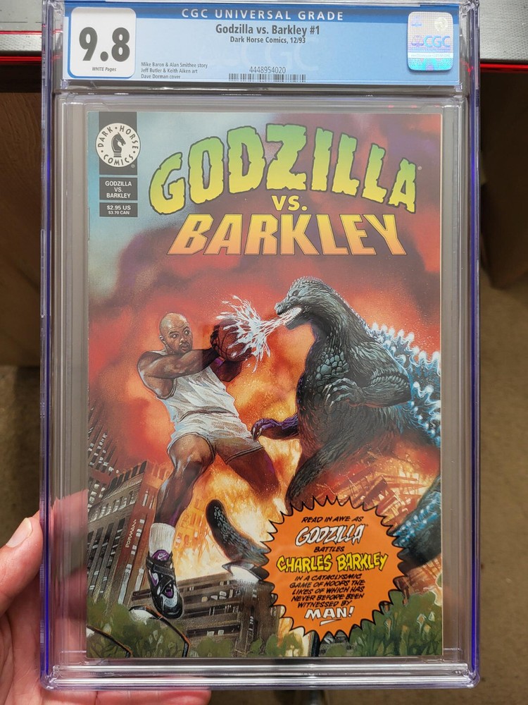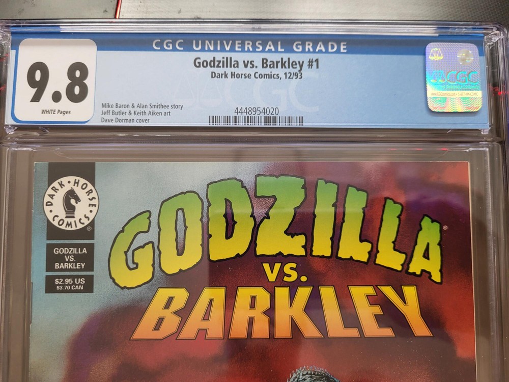 up for sale is Godzilla vs. Barkley #1 in a CGC 9.8 white pages. The book in the pics is the book you will receive. I will ship USPS Priority in the following way: I will sandwich the book between sheets of rigid cardboard and place in a gemini mailer. Then all that goes in a sturdy cardboard box surrounded by packing peanuts or bubble wrap. Please read before buying: THERE ARE NO RETURNS ON SLABBED BOOKS