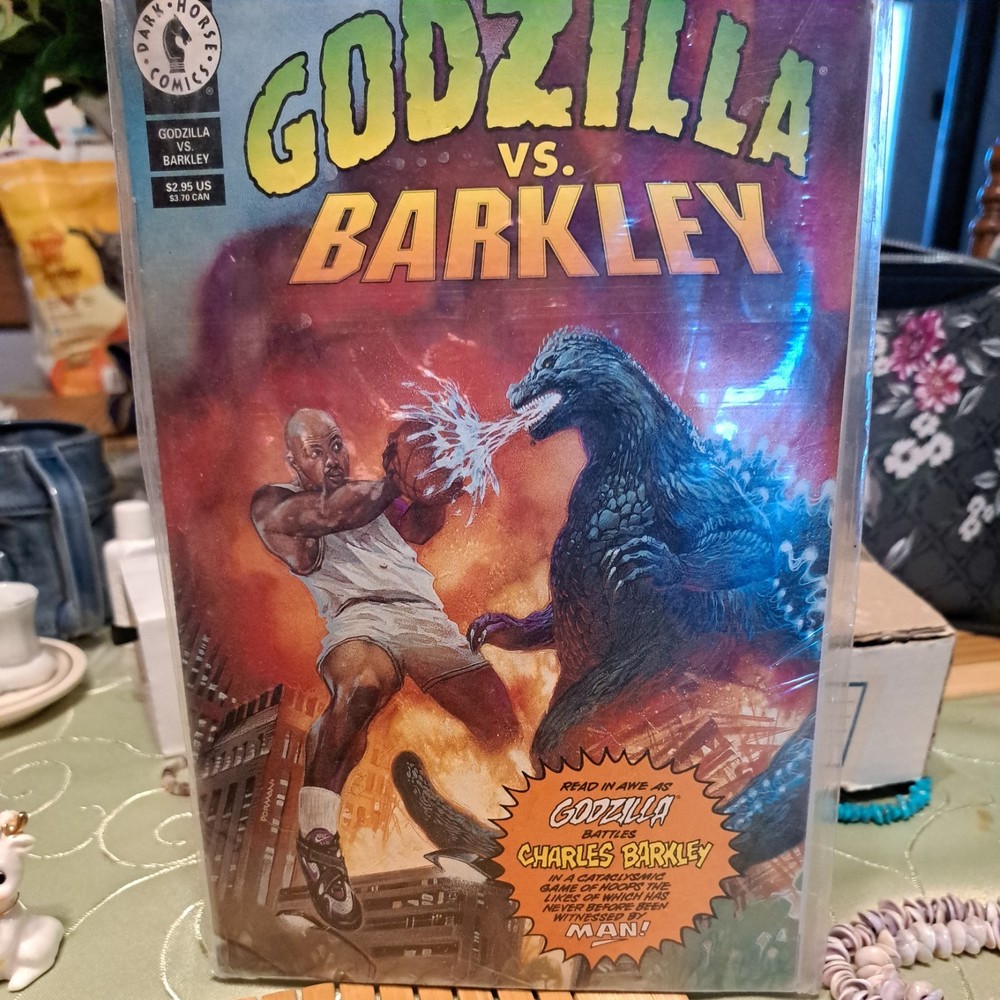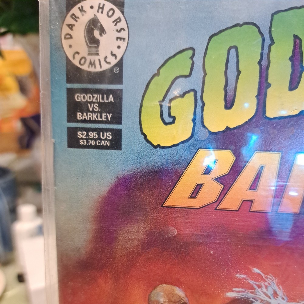The product is a vintage comic book titled "Godzilla vs. Barkley #1" published by Dark Horse Comics in 1993. The comic features characters Godzilla and Charles Barkley in a science fiction and sports genre storyline. The cover art was done by Dave Dorman, and the comic is a first printing and 1st edition in color. This collectible item is a US Comics tradition and was written by various artists and writers including James Sinclair, Alan Smithee, Jeff Butler, Keith Aiken, and Mike Baron.