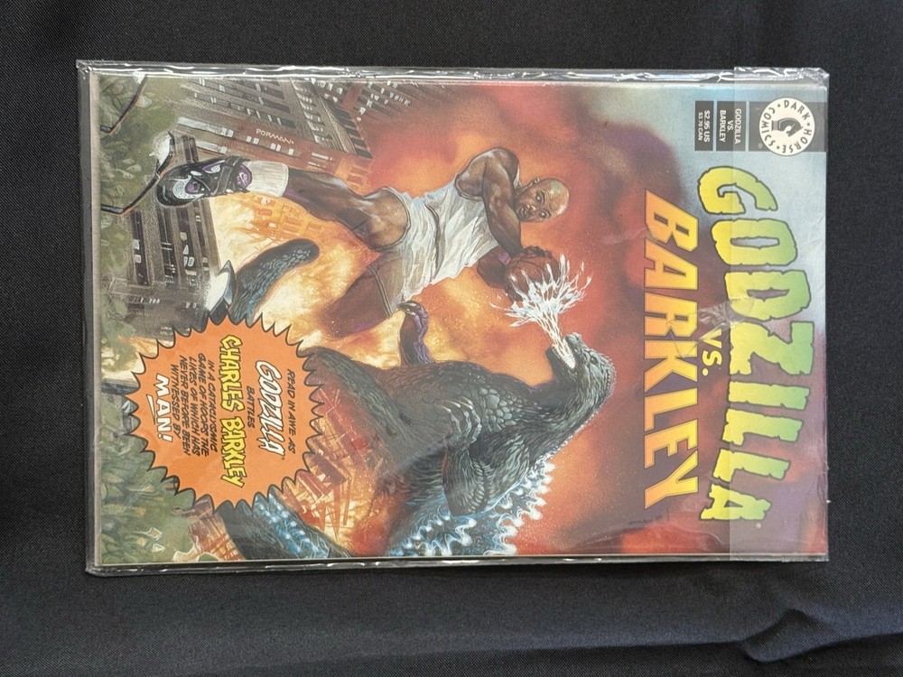 This comic book was purchased by me as a child at the comic book store in Petaluma, CA. I never opened it as it’s in the packaging straight from the comic book shop. Pretty cool. Hope to find a good home for it! Dive into the world where monstrous creatures clash in the pages of "Godzilla vs. Barkley," a compelling tale from December 1993, published by Dark Horse Comics. This comic book brings together the legendary beast and basketball icon Charles Barkley in a showdown that's as thrilling as it is imaginative. Crafted by a team of acclaimed artists and writers, including James Sinclair, Alan Smithee, Jeff Butler, Keith Aiken, and Mike Baron, with a striking cover by Dave Dorman, this issue is a standout addition to any collector's array. Set in the Modern Age of comics, this piece offers a unique fusion of science fiction and sports genres, presented in English. Engage with a narrative that captures the essence of the era and continues the rich tradition of US Comics. Whether you're a dedicated fan of the franchise or a connoisseur of gripping storytelling, "Godzilla vs. Barkley" is a comic book that stands the test of time.
