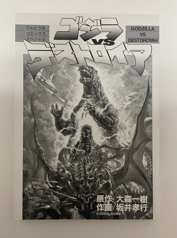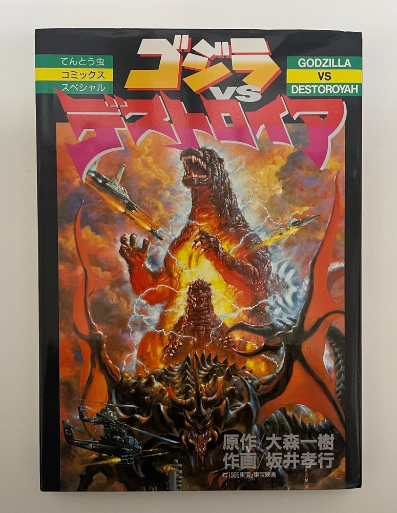1995 manga of Godzilla vs. Destoroyah in very good condition. Removable dust jacket has some shelf wear and slight indentation on back cover. Actual book is in excellent condition. From a smoke free collector of kaiju and tokusatsu memorabilia.