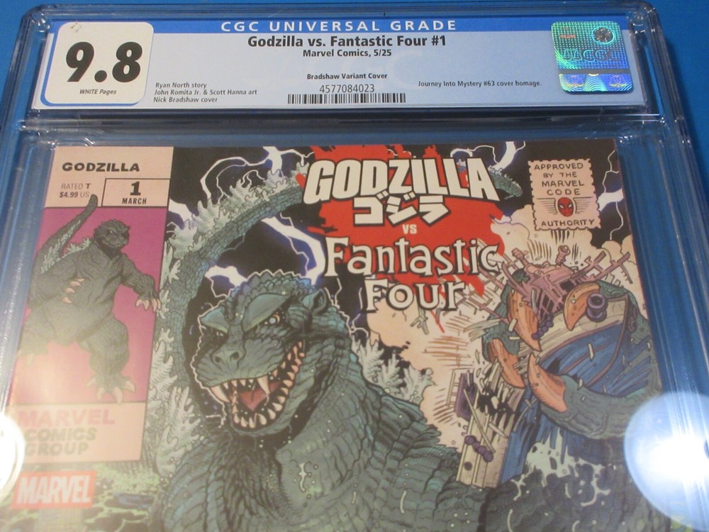 This auction is for Godzilla vs Fantastic Four #1 variant in CGC 9.8 with a new case condition. This week we are selling an incredible collection including Amazing Spider-man , Silver Surfer, Dr. Strange, X-men, Iron Man, Hulk, Fantastic Four, Black Panther, Batman, CGC books and many other 1st appearance key issues. You are sure to find something you are looking for this week. Bonus Offer! Win 2 or more comics and get a bonus comics (10 dollar minimum) and an upgraded bonus if you win 10 auctions. Our Shipping rates are: USA: 5 dollar flat rate shipping on raw comics with no limit. Canada: 16 Dollars for the 1st comic and 1.50 each after that. International: 18 dollars for the 1st comic and 1.50 each after that. CGC books are 11.99 flat rate shipping for up to 20 CGC slabs in the USA, 24 bucks and 12 combined for Canada and 28 bucks and 14 combined for international. Australia is more. Feel free to ask questions. I guarantee superfast Domestic shipping! ...to open their eyes...that they may receive forgiveness of sins and a place among those who are sanctified by faith in me. Acts 26:18