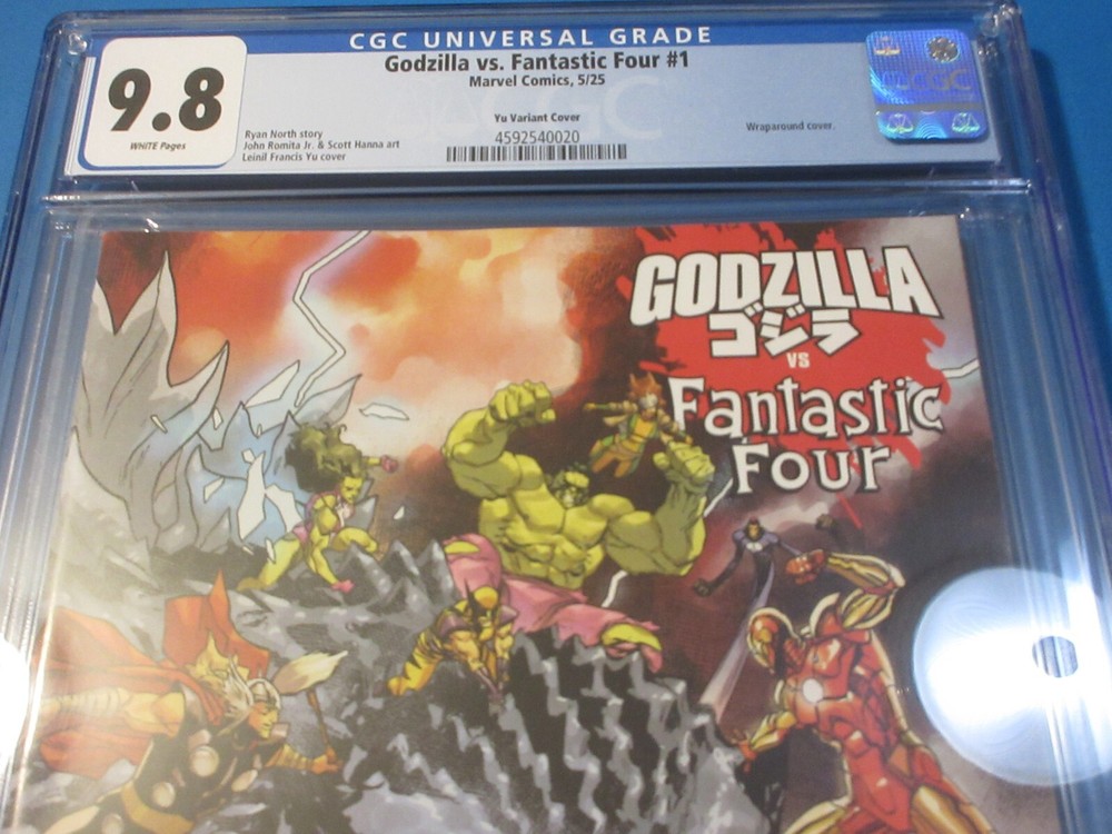 This auction is for Godzilla vs Fantastic Four #1 variant in CGC 9.8 with a new case condition. This week we are selling an incredible collection including Amazing Spider-man , Silver Surfer, Dr. Strange, X-men, Iron Man, Hulk, Fantastic Four, Black Panther, Batman, CGC books and many other 1st appearance key issues. You are sure to find something you are looking for this week. Bonus Offer! Win 2 or more comics and get a bonus comics (10 dollar minimum) and an upgraded bonus if you win 10 auctions. Our Shipping rates are: USA: 5 dollar flat rate shipping on raw comics with no limit. Canada: 16 Dollars for the 1st comic and 1.50 each after that. International: 18 dollars for the 1st comic and 1.50 each after that. CGC books are 11.99 flat rate shipping for up to 20 CGC slabs in the USA, 24 bucks and 12 combined for Canada and 28 bucks and 14 combined for international. Australia is more. Feel free to ask questions. I guarantee superfast Domestic shipping! ...to open their eyes...that they may receive forgiveness of sins and a place among those who are sanctified by faith in me. Acts 26:18