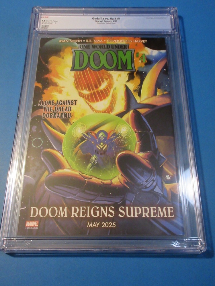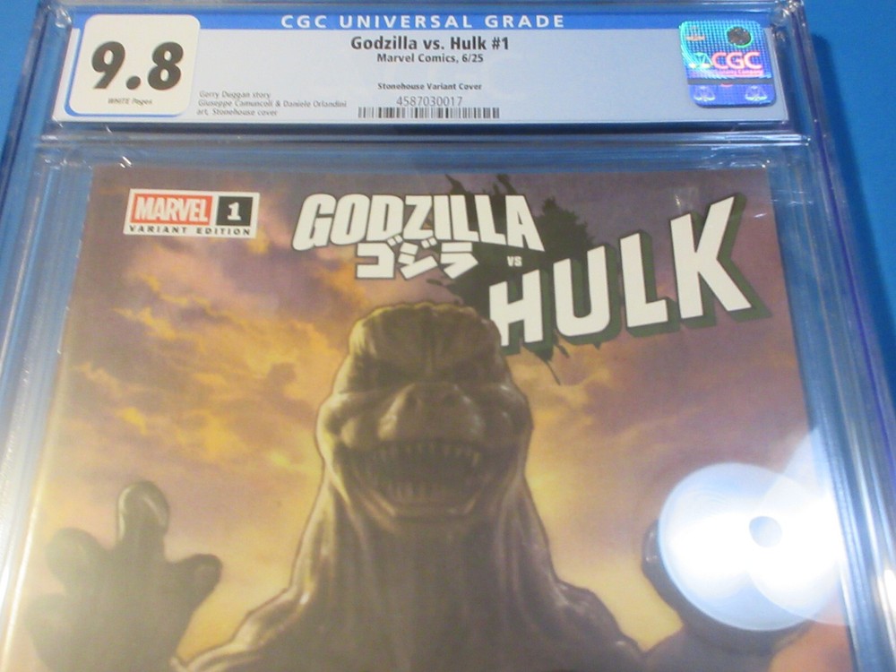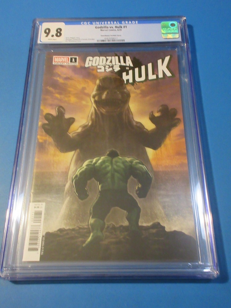 This auction is for Godzilla vs Hulk #1 variant in CGC 9.8 with a brand new case . This week we are selling an incredible collection including Amazing Spider-man , Silver Surfer, Dr. Strange, X-men, Iron Man, Hulk, Fantastic Four, Black Panther, Batman, CGC books and many other 1st appearance key issues. You are sure to find something you are looking for this week. Bonus Offer! I will add a bonus comic book for every 10 auctions you pay for on the same invoice this week. Our Shipping rates are: USA: 5 dollars for single comics with no limit, multiple comic lots have a charge and additional combined lots are half price. Canada: 16 Dollars for the 1st comic and 1.50 each after that. International: 18 dollars for the 1st comic and 1.50 each after that. CGC books are 11.99 flat rate for up to 20 slabs in the USA, 22 bucks and 10 combined for Canada and 28 bucks and 14 combined for international. Feel free to ask questions. I guarantee superfast Domestic shipping! ...to open their eyes...that they may receive forgiveness of sins and a place among those who are sanctified by faith in me. Acts 26:18