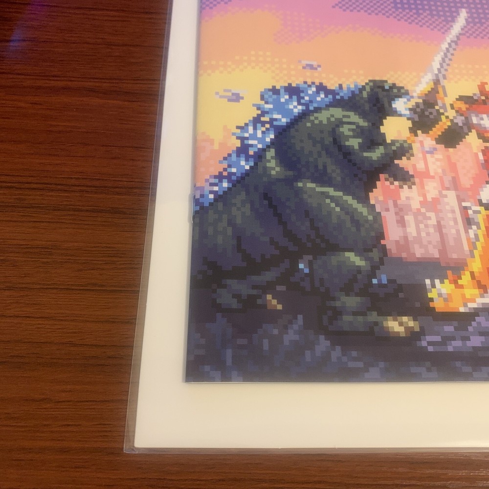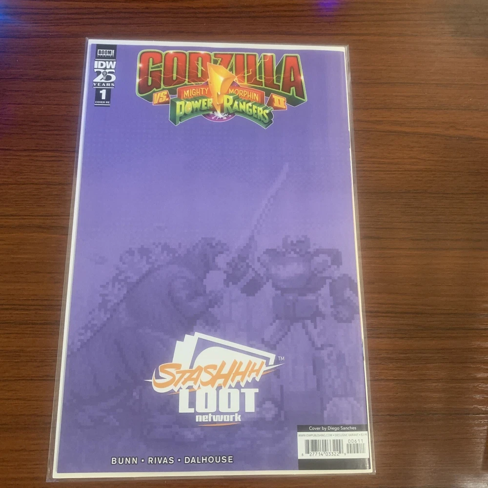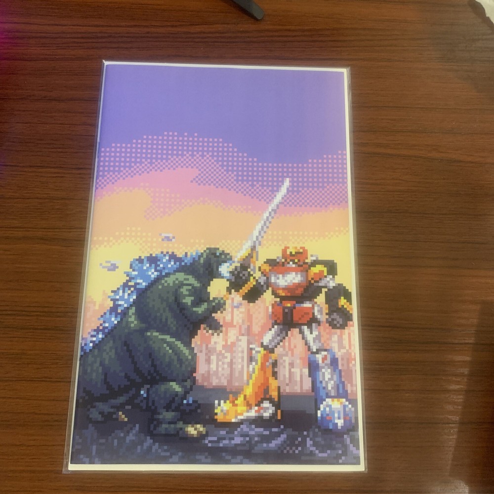 The product is a comic book titled "Godzilla vs Mighty Morphin Power Rangers #1 Sanches 8-Bit Virgin Variant MMPR". It features a virgin variant cover illustrated by Diego Sanches and is published by IDW. The comic is part of the Power Rangers series and is set in the Power Rangers universe. The issue number is 1 and the publication year is 2024. The comic book is a collectible item for fans of US Comics, Godzilla, and the Mighty Morphin Power Rangers superhero team.