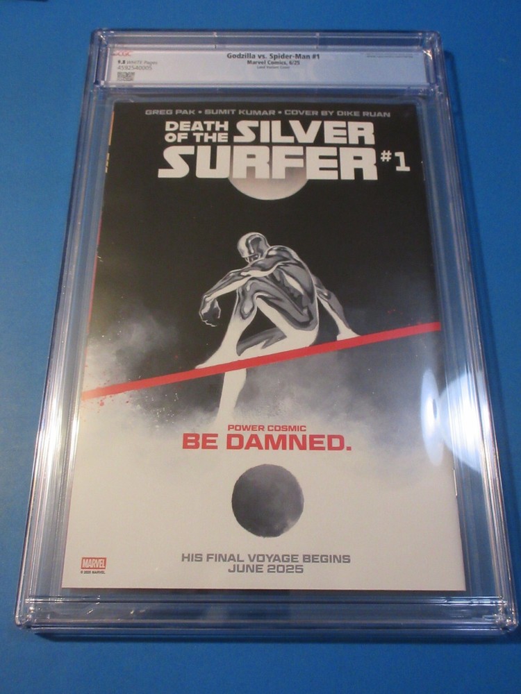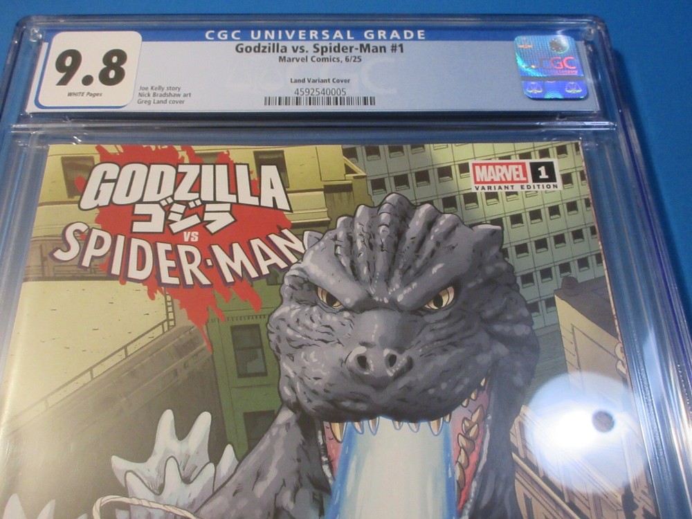 This auction is for Godzilla vs Spider-man #1 variant in CGC 9.8 with a new case condition. This week we are selling an incredible collection including Amazing Spider-man , Silver Surfer, Dr. Strange, X-men, Iron Man, Hulk, Fantastic Four, Black Panther, Batman, CGC books and many other 1st appearance key issues. You are sure to find something you are looking for this week. Bonus Offer! Win 2 or more comics (10 dollar minimum)and get a bonus comics and an upgraded bonus if you win 10 auctions. Our Shipping rates are: USA: 5 dollar flat rate shipping on raw comics with no limit. Canada: 16 Dollars for the 1st comic and 1.50 each after that. International: 18 dollars for the 1st comic and 1.50 each after that. CGC books are 11.99 flat rate shipping for up to 20 CGC slabs in the USA, 24 bucks and 12 combined for Canada and 28 bucks and 14 combined for international. Australia is more. Feel free to ask questions. I guarantee superfast Domestic shipping! ...to open their eyes...that they may receive forgiveness of sins and a place among those who are sanctified by faith in me. Acts 26:18
